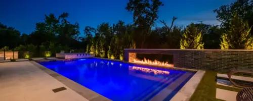 - Features: Blue Surf PebbleSheen • Fire Pit • Glass Tile • Line Burner • Putting Green • Raised Spa • Scuppers • Smoke Lueders • Turf •