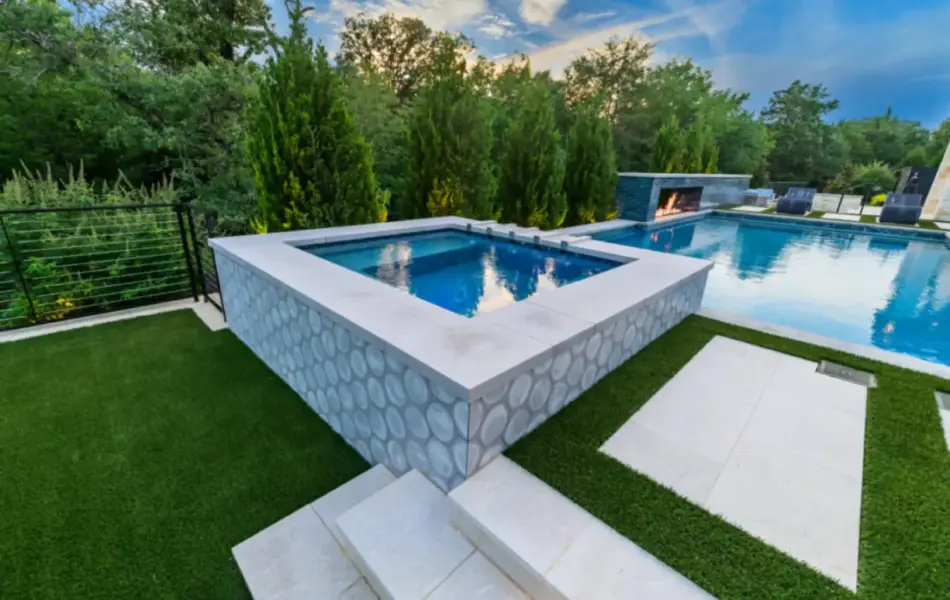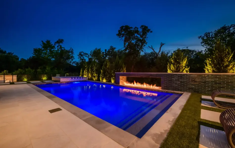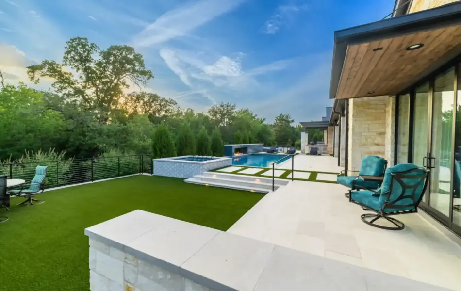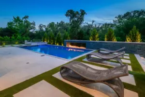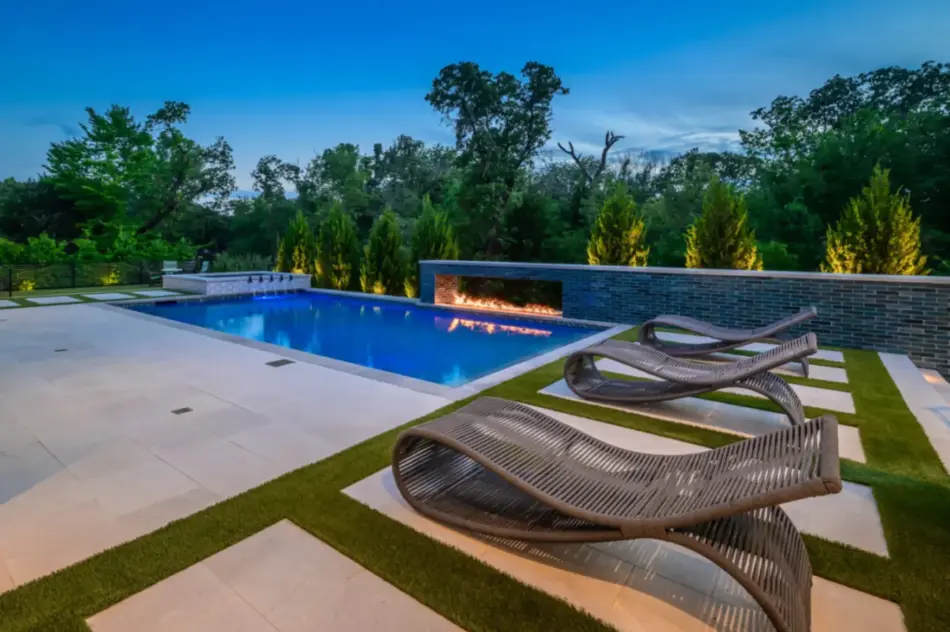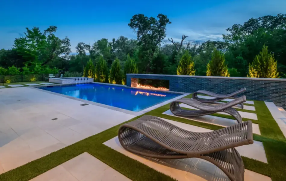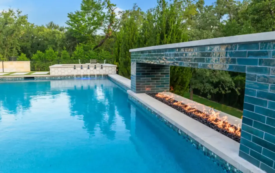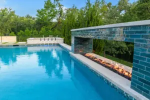 - Features: Blue Surf PebbleSheen • Fire Pit • Glass Tile • Line Burner • Putting Green • Raised Spa • Scuppers • Smoke Lueders • Turf •