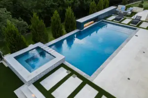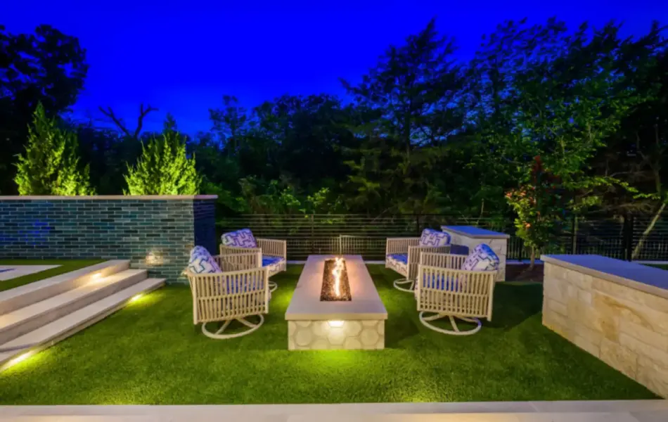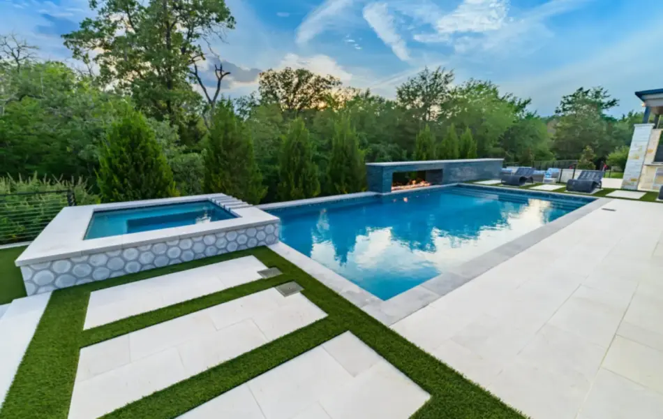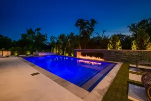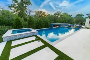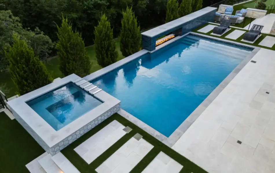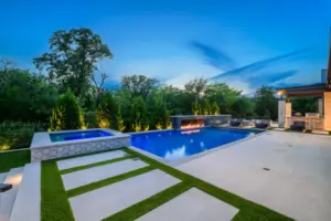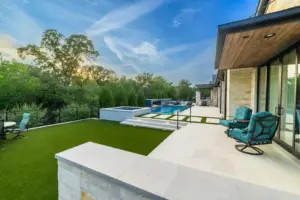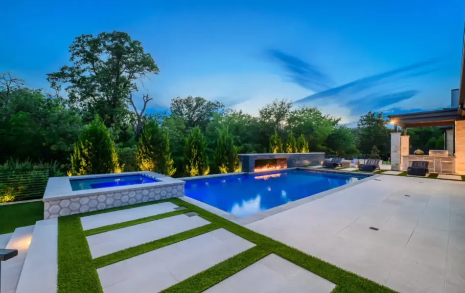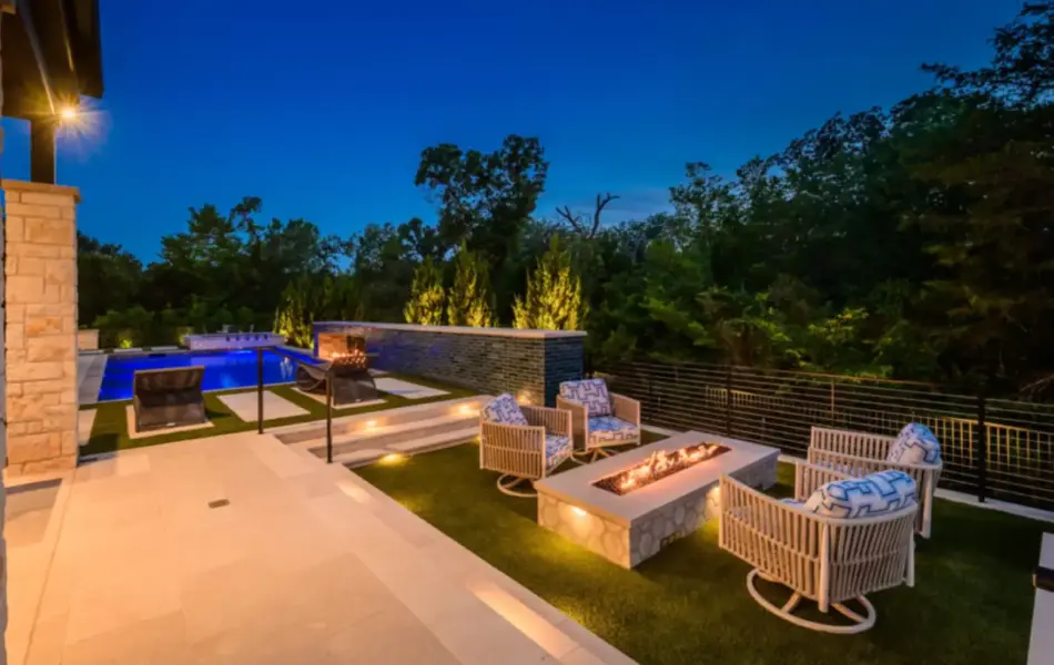 - Features: Blue Surf PebbleSheen • Fire Pit • Glass Tile • Line Burner • Putting Green • Raised Spa • Scuppers • Smoke Lueders • Turf •
