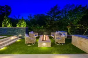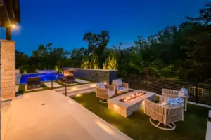 We wanted to preserve the view to the natural greenbelt while creating a focal point visible from the great room of the house. The fire feature accomplishes this beautifully, and by adding the picture frame, we seamlessly connect the architecture with the natural backdrop. The subway tile complements the linear design of the fire feature, while the wall transitions across the deck, replacing a railing for added safety. Stepping down to the fire pit gathering space and the turf with a putting green maximizes the use of the steep hillside lot. Custom stainless scuppers enhance the raised linear look of the fireplace wall, providing a gentle, understated water sound. The spa veneer adds a touch of looseness, preventing the overall design from feeling too modern. Retaining walls were built to create planting spaces and functional level areas for additional gathering spots. Cable railing on top of the walls ensures safety without obstructing the view. This design creates a seamless transition from home to nature, offering a space to be enjoyed every day and night.