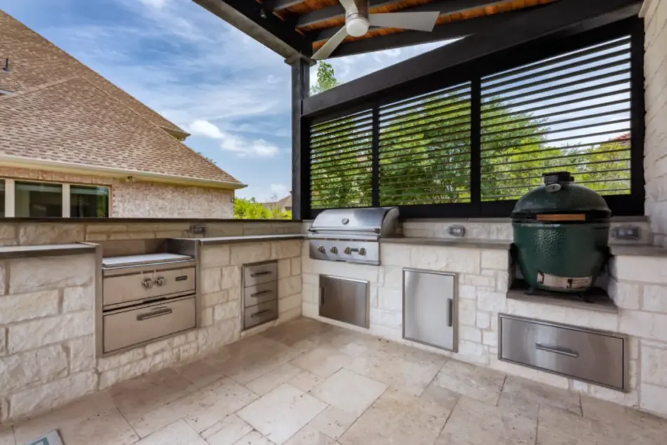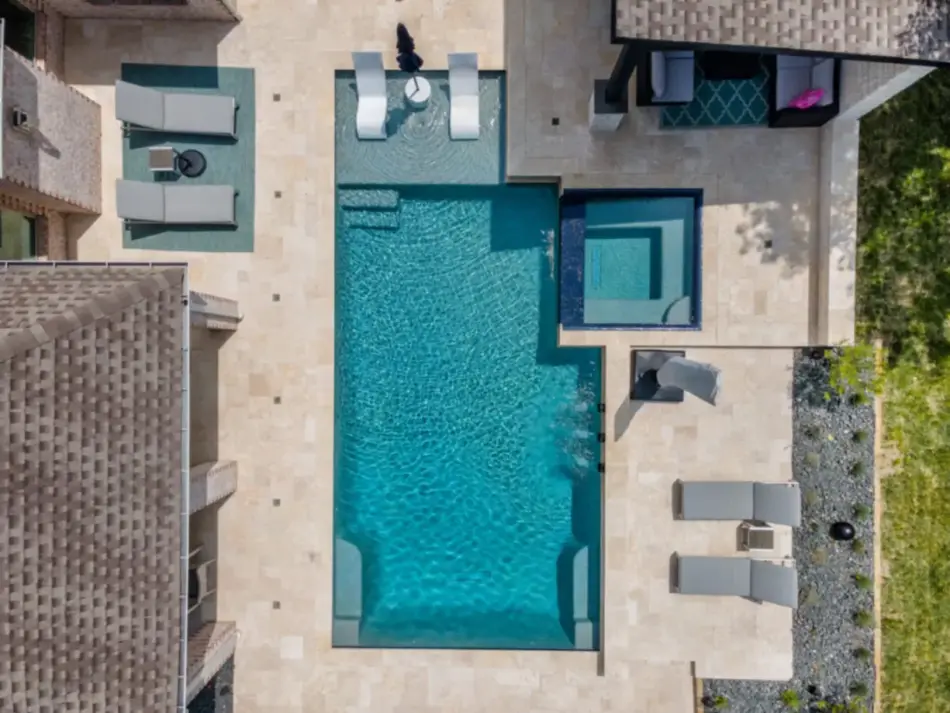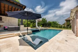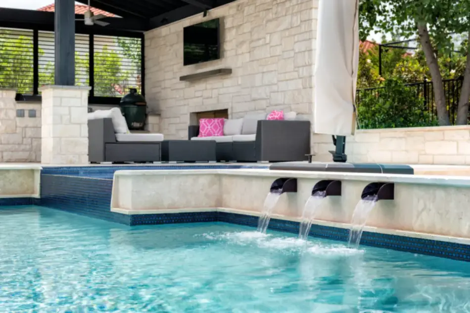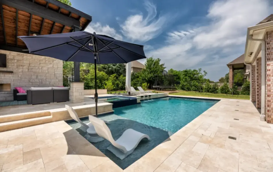 • Features: Aqua Blue PebbleSheen Cabana Ivory Travertine Outdoor Kitchen Raised Spa Rolled Edge Spa Scuppers Tanning Ledge