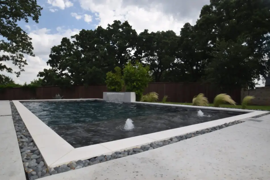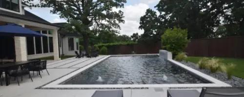 This contemporary straight line pool plays off of the white stone and black accents of the house. The Black Onyx Pebblesheen pool interior contrasts beautifully with the clean white coping. The raised beam is veneered with large white porcelain tile behind a sleek 6 foot sheer descent water feature. Black river rock boarders the pool and concrete block out path to add texture and contrast. The bubblers on the sun deck and the large sheer descent add the perfect amount of calming sound to aid in drowning out any nearby traffic. This is a simple but carefully thought out design that fits the client’s specific style.