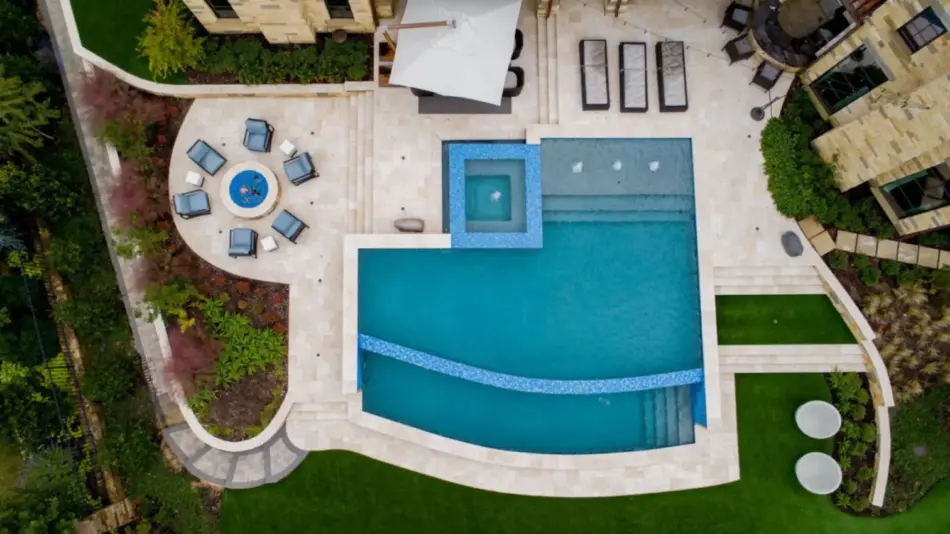 - Features: Bubblers • Fire Pit • Ivory Travertine • Milsap Stone • Negative Edge • Tanning Ledge •