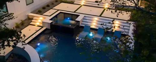 This custom modern project was a thrill to create! The client wanted a unique shape, loaded with light, water, and fire features. Along with a tanning ledge, and custom raised spa, this beautiful project is the perfect escape for this family.