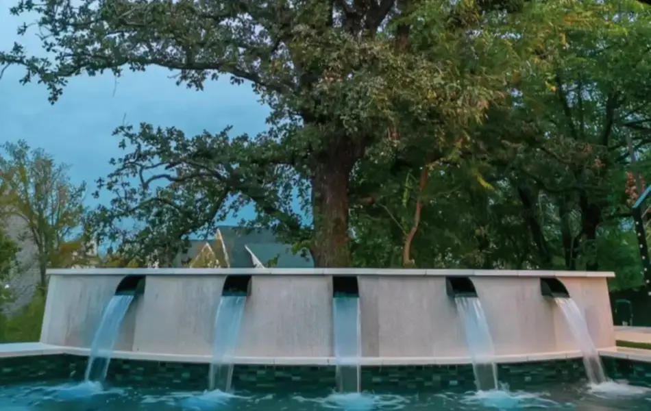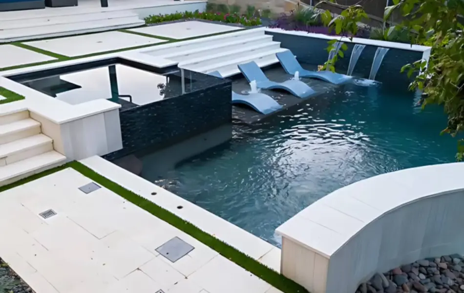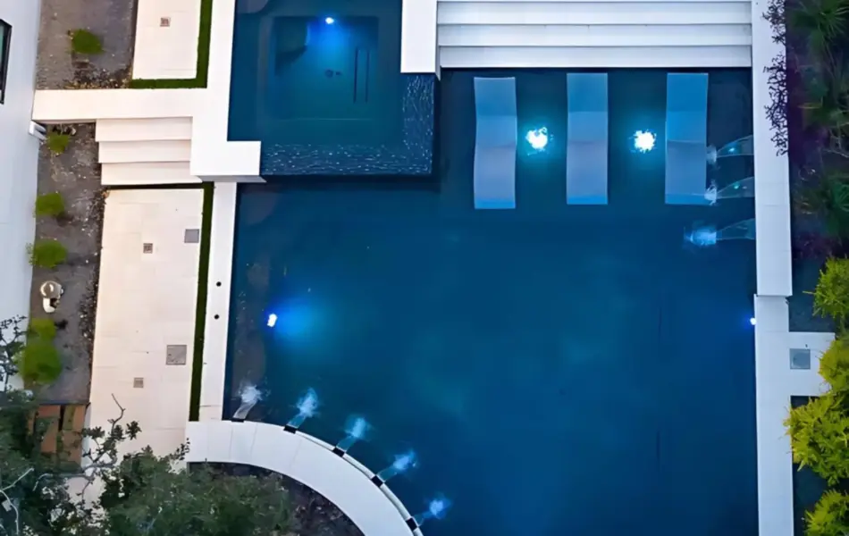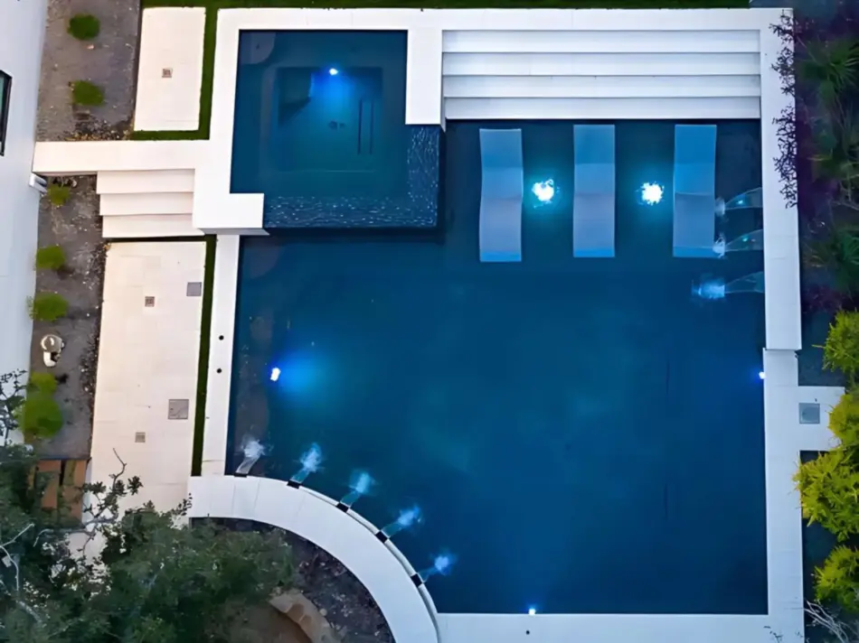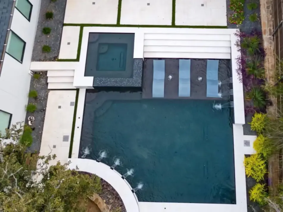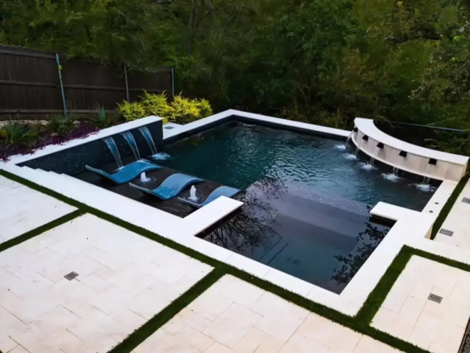- Features: Black Onyx PebbleSheen • Bubblers • Step Lights • Tanning Ledge • Water Wall • Waterfall •