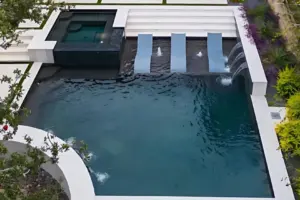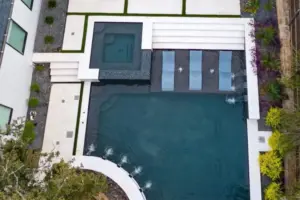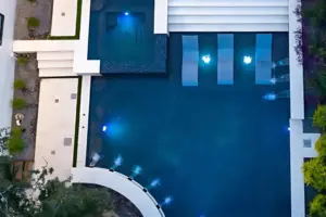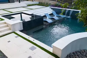 This custom modern project was a thrill to create! The client wanted a unique shape, loaded with light, water, and fire features. Along with a tanning ledge, and custom raised spa, this beautiful project is the perfect escape for this family.