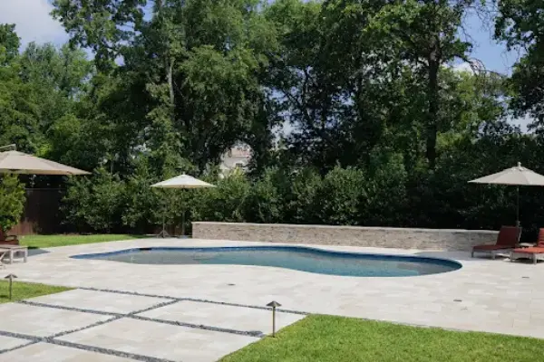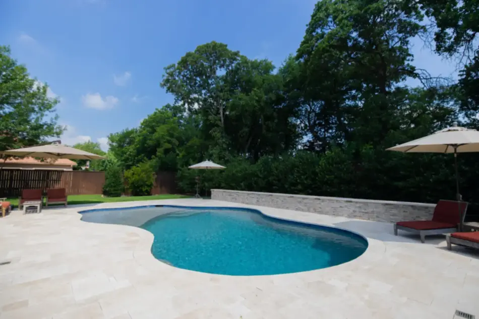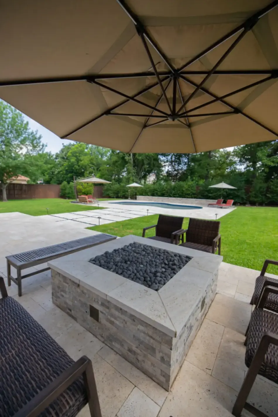• Features: Blue Surf PebbleSheen Fire Pit Ivory Travertine Raised Beam Silver Travertine