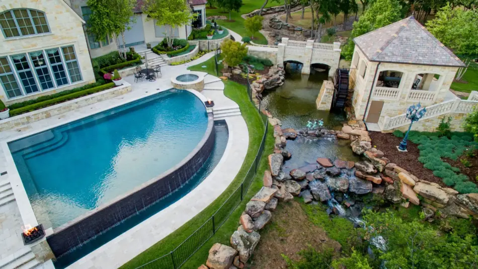 When the owner requested what he wanted, we said we could provide his dream along with the help of many engineers. The centerpiece was the pool, providing the transition from the Formal French style home to the natural surroundings. The simple curved vanishing edge wall clad in dry stack slate provided the transition. The pool was piered due to the proximity to the 30-foot cliff down to the pond. A new dam, dredging out the swamp, while diverting water from natural spring and diverting subdivision drainage filled with sediment around the pond location (around one side of the house) and three year process with the Army Corp of Engineers got the pond back. All equipment for the project was located in the lower level of the two level cabana. The water wheel provides the focal point, fit with the French style and became part of the elaborate drain system for the subdivision. The dry stream becomes a large creek with rainfall so the bridge and cabana engineering created a solution to handle everything. The basin to trap sediment before going to the pond (around other side of pond) also created water for the water wheel. Terraces from the Great Room provided seating areas for large and small gatherings where you can try to take in all of the owner’s dream and more.