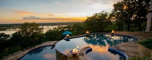 A city that would not allow any wall over 4’ tall and 21’ drop creates challenges. A client who wants rustic tailored finish to blend with the existing flagstone porch and accent the great lake view. Solution A top pool provide shallow area for basketball, volleyball and hanging out. The spa overlooks both pools and the lake but is right next to the master door. Fire bowls frame the spectacular evening view. The lower pool provides diving and the hidden slide exit (not seen from the upper porch). The diving well acts as a key way for the hillside. Flagstone decks and cut stone veneer provide the rustic tailored finish. Landscape softens the setting and the grasses will hide the fence in no time. Solution is spectacular.
