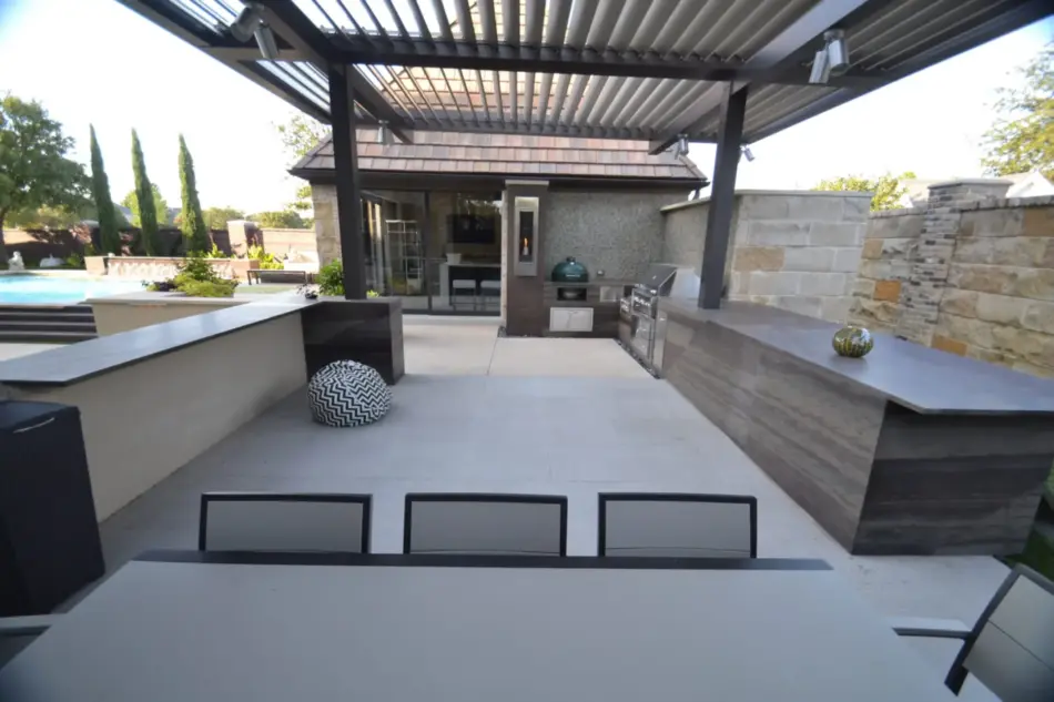 View of yard blocked by fireplace and unique= Remove fire place and build circular daybed which design radius around Traditional home and unique contemporary= blended colors and tone to unify architecture and pool environments with unique materials, granite patio caps, mitered cut tile step threads and risers, tumbled glass seeded decks, metal louvered arbor, granite counters