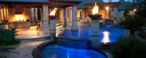 - Why do you think this project forced you to an unusual level of creativity? How do you unify all the features desired in a small space and give a feeling of everything fits. Elevation helped define different spaces and create the feeling of a larger space. Raising the main patio allowed for larger water features gave height for grotto and provides the observation deck for the yard. Lowering the spa created a more private space and the opportunity for more waterfeature. The screen wall gave total privacy from the neighbors and created the awesome waterwall and pedestal for the water pots. The cabana arbor allowed for a shaded tanning ledge and a 16’ rainfall. Enough room was left for planting to soften all the hard lines. The fire bowls were to low grandchildren safety so we added reverse taper and raised the pedestals.