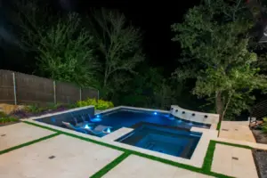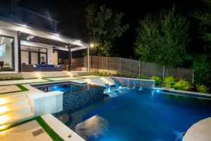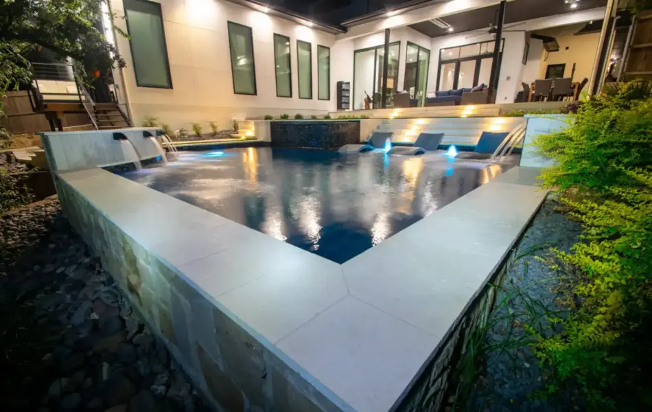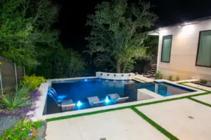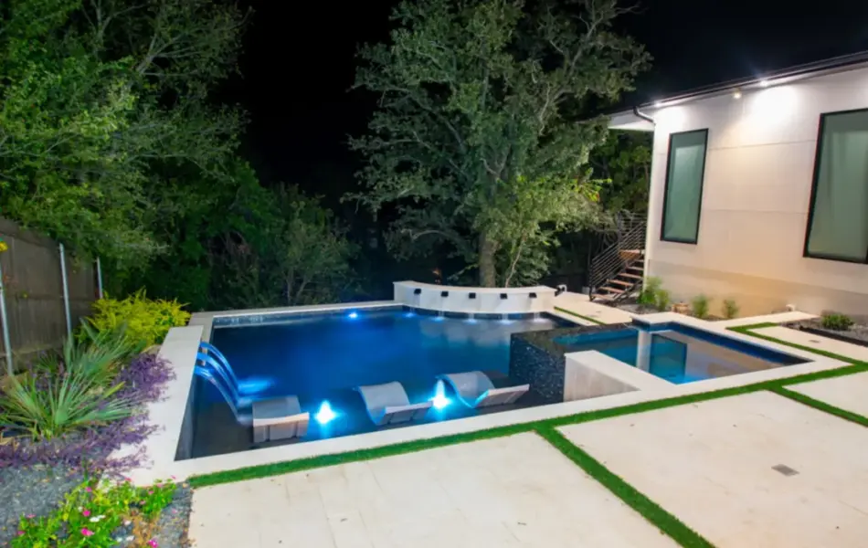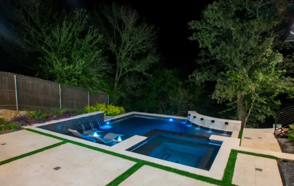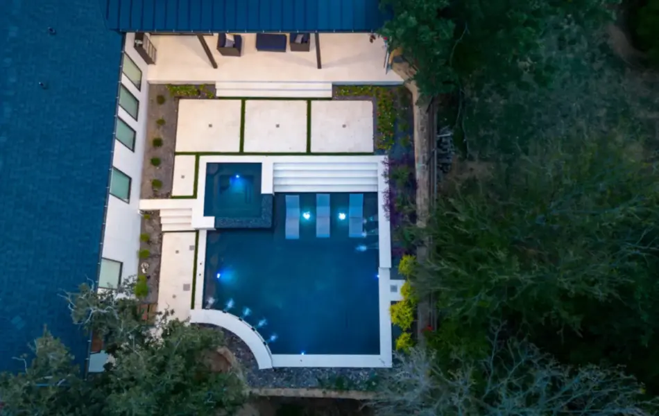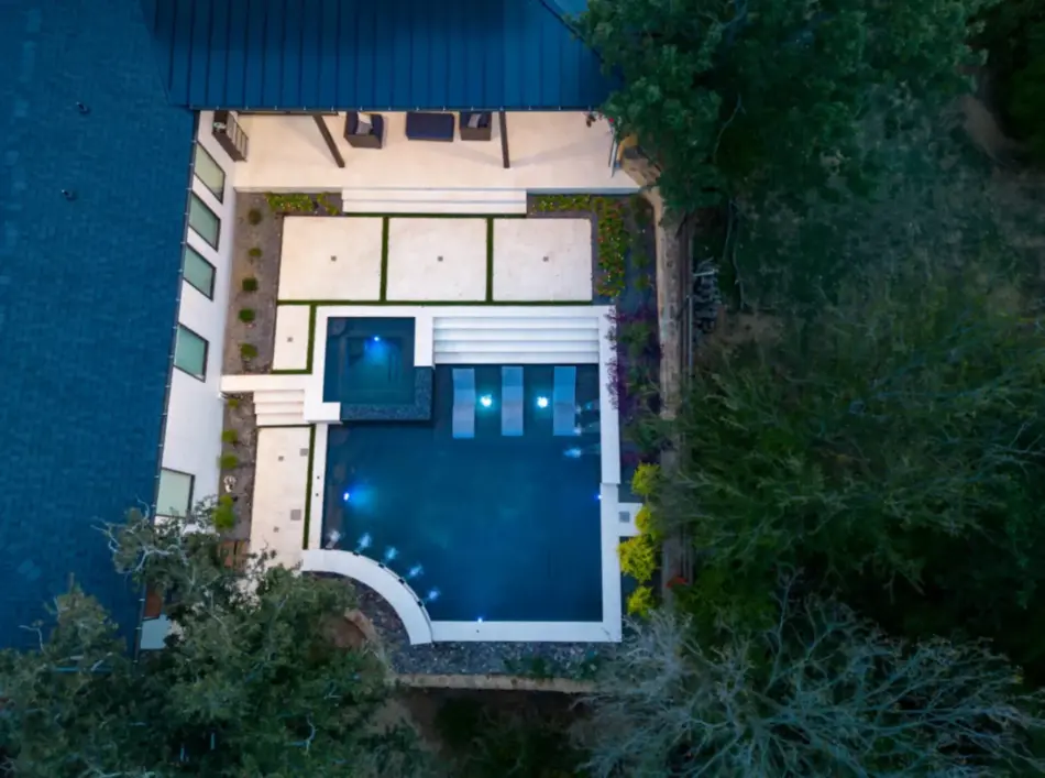 The pool’s unique, modern shape was carefully designed to preserve an existing oak tree and fit seamlessly into the compact space. Light-colored limestone and tile were chosen to match the home’s stucco, while black pool finishes echoed the house’s accents. Water feature walls were strategically placed to manage the property’s grade and create focal points for views from both the family room and master bedroom. A finger ledge on the raised back wall provides safety and a convenient spot to rest a drink, while the reflective spa, flush with the middle terrace, offers uninterrupted views. To enhance accessibility, part of the lower wall was removed to add steps to the lowest level, which also facilitated plumbing connections. Finally, turf was added to the terraced patios to introduce greenery, blending with the plantings that soften the space’s edges. The result is a visually striking and functionally unique design that fully maximizes the challenging site.