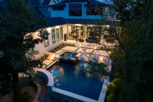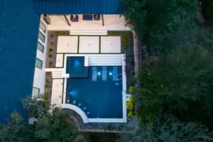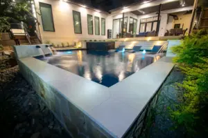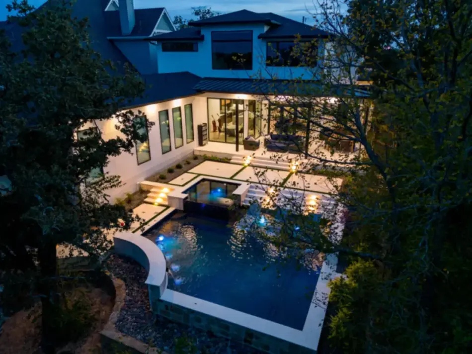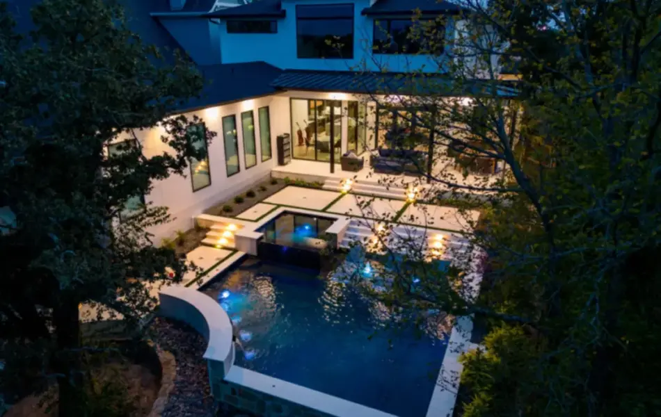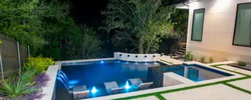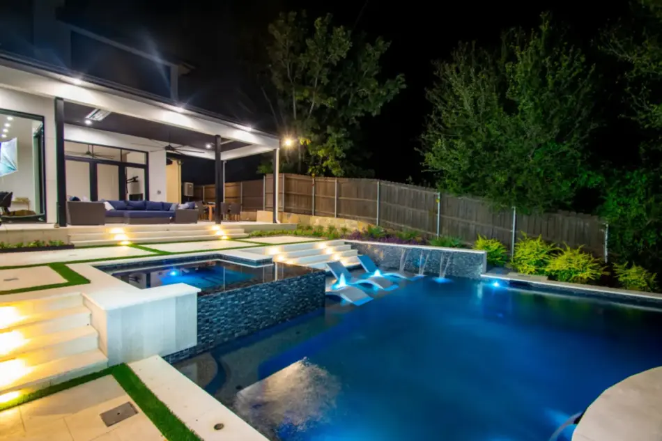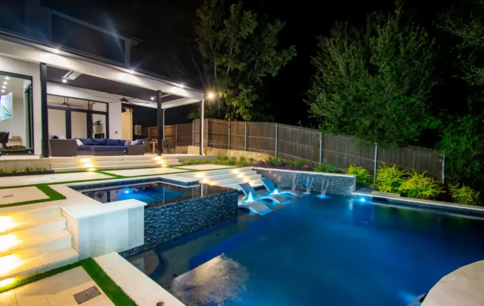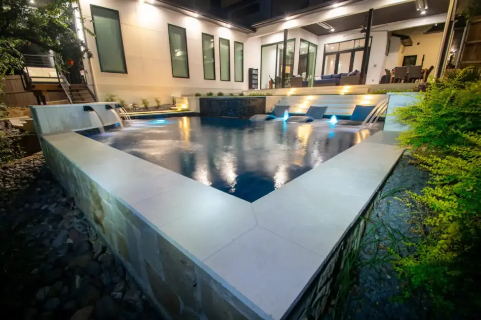 The pool’s unique, modern shape was carefully designed to preserve an existing oak tree and fit seamlessly into the compact space. Light-colored limestone and tile were chosen to match the home’s stucco, while black pool finishes echoed the house’s accents. Water feature walls were strategically placed to manage the property’s grade and create focal points for views from both the family room and master bedroom. A finger ledge on the raised back wall provides safety and a convenient spot to rest a drink, while the reflective spa, flush with the middle terrace, offers uninterrupted views. To enhance accessibility, part of the lower wall was removed to add steps to the lowest level, which also facilitated plumbing connections. Finally, turf was added to the terraced patios to introduce greenery, blending with the plantings that soften the space’s edges. The result is a visually striking and functionally unique design that fully maximizes the challenging site.