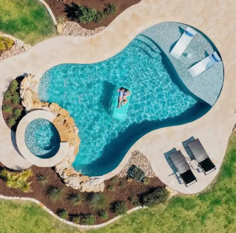 - Features: Aqua Blue PebbleSheen • Boulders • Bubblers • Ledge Lounger • Raised Spa • Tanning Ledge • Waterfall •