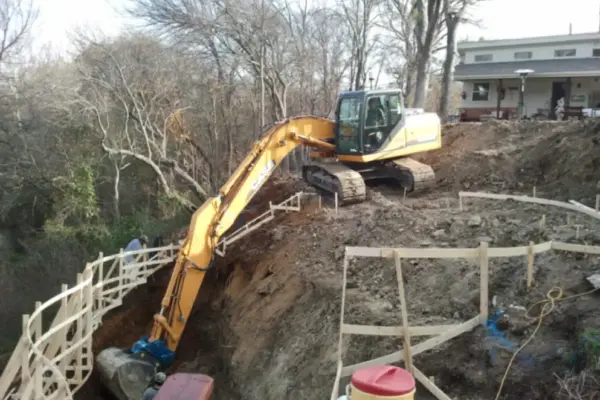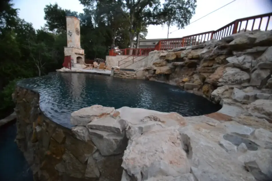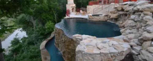 Slope was too steep for drilling piers so with consulting with the engineer on site solution was reached. The vanishing edge basin would create a keyway into the slope. To dig the vanishing edge basin into the slope required we tear out 10’ by20’ section of the drain way out. We then could create a ramp down, create a platform to work on and then reach down to dig, stem and gunite the basin. The weir wall was then built inside the gunited tank up to the pool. Limestone boulder waterfall provided the 6’ retaining wall from the driveway down to the pool and patio. A ramp parallel the stairs to allow equipment rolled up and down the space. The fireplace flooring and clock work to grade was almost as tall as the fireplace itself. The 7’ drop from the pool down to the vanishing edge basin was faced in rough limestone as well as the 7’ drop from the top of the tank to the grade below. Pool is private 6’ below the road out front and from the lake looks like a giant waterfall, with no visible pool; Iron steps allow access down to the vanishing edge equipment. The salt deck will weather to be the same color as the limestone. Black pebble was used to blend with the lake below. Three LED lights were used to overpower the black interior. Clown Fish decorate the top step because they are the granddaughter’s favorite. Creating the family’s favorite space to enjoy the quiet and serine setting on a useless hillside. Priceless.