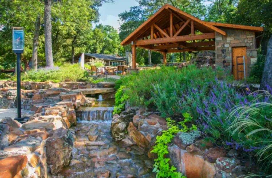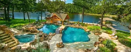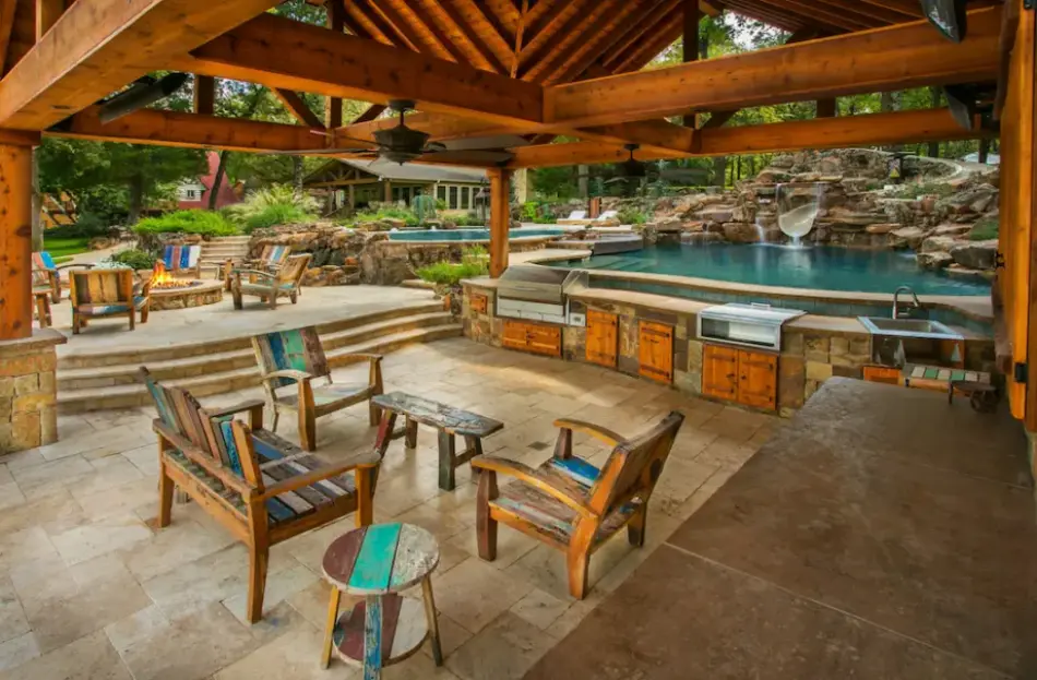 - Features: Basketball Hoop • Beach Entry • Bridge • Cabana • Moss Rock Boulders • Oklahoma Flagstone • Outdoor Kitchen • Rustic Ivory Travertine • Slide • Turtle Bay PebbleSheen • TV • Waterfall •