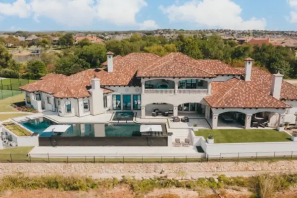 This large Infinity edge pool overlooking a lake is perfection! The customer wanted volleyball and basketball capabilities as well as diving, so the pool was designed to accommodate all the fun. The client wanted their over-sized hot tub to be a focal point out their living room doors and it turned out beautifully! Before our masterpiece could be achieved, an entire pool, negative edge, spa, huge slide structure, and decking had to be demo and removed so we could start with a clean slate. This project was overall designed to create a seamless transition from the home out to the pool area. Products, colors, and landscape were planned together to make it seem as if the pool was planned to be there the entire time!
