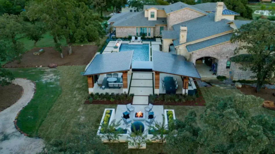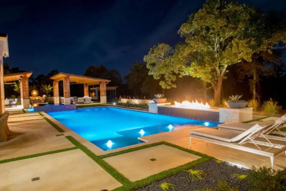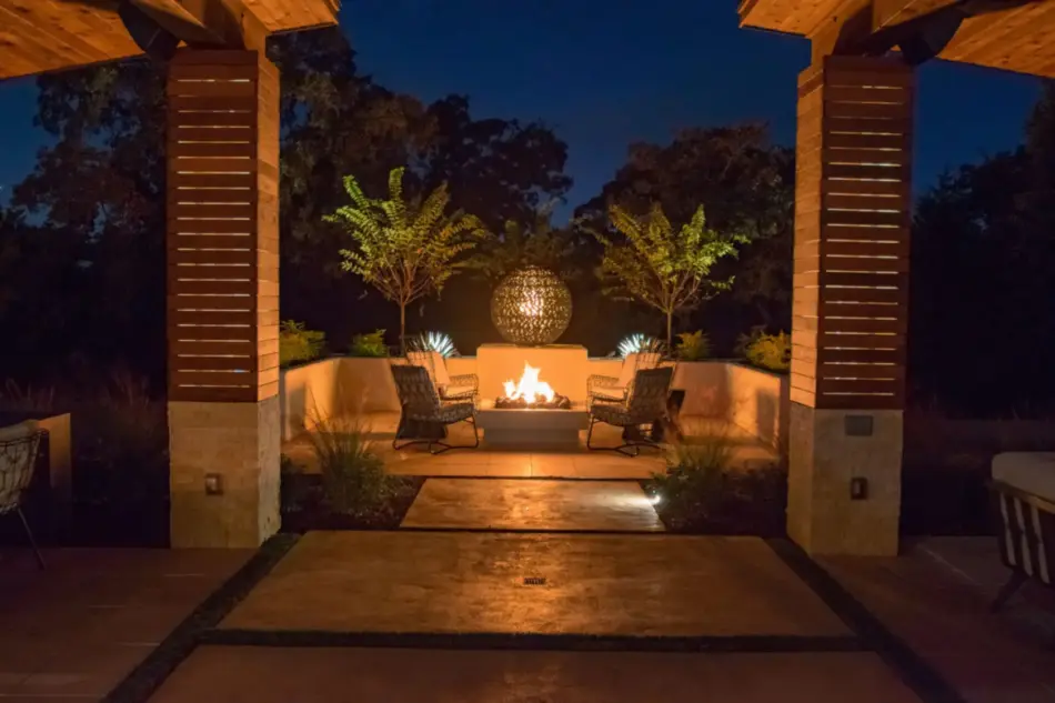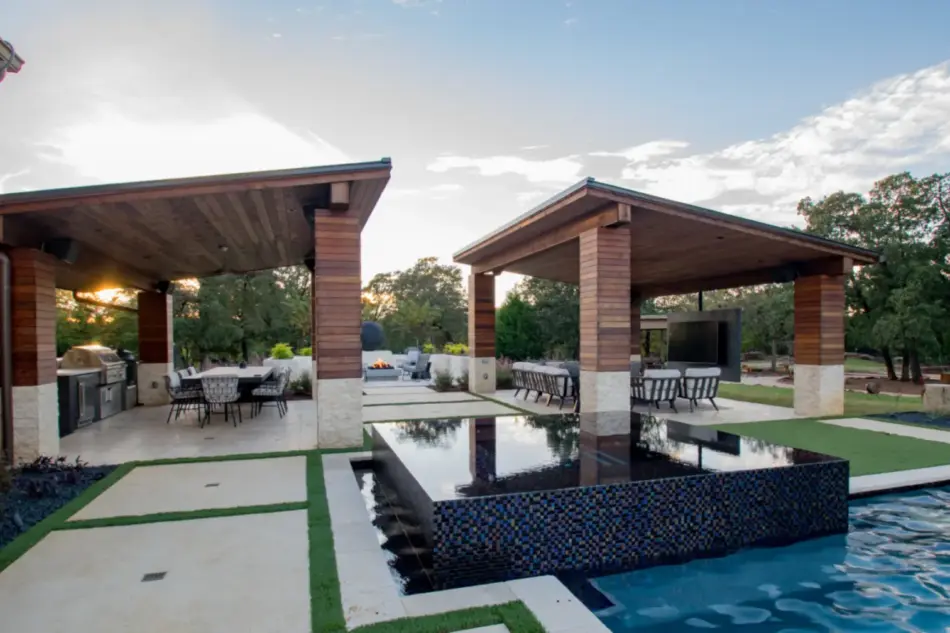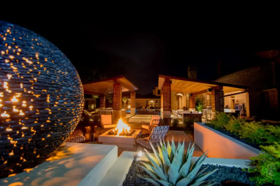 Lightness verses darkness theme carries through this project including never used materials and details to create this transitional gem. The axis and cross axis have stunning water and fire feature elements in the asymmetrical design. To open views to the yard from the family room, the existing outdoor kitchen was removed. The black precise stacked slate spillway provides sound and visual effect and contrasted with the fire line burner visible from everywhere inside. This draws you out to enjoy the pool, and a lot more. The pool offered great places to hang out with the tanning ledge and built in bar stools and lots of room for the game of volleyball. The cross axis from the master bedroom draws the eye across the pool, through the black all tile vanishing edge spa, splitting the dual cabanas, through the fire pit, to gaze on the “Dark Planet” sculpture. The poured in place colored concrete planters wrap around the fire pit and provide plants and landscape lighting to accent the space. Lighting through the Epay wood and travertine cabana columns provide additional glow at night to frame the “Dark Planet” starburst light. The cabanas were divided into entertainment and dining. The graphite air slate, from Spain, covered the entertainment floating center and the cooking counter. The counter was capped in Danae Natural Dekton and the 10′ custom floating table was wrapped in Sirius Solid Dekton. Ivory Travertine in a stack bond pattern accented the cabanas, porch, fire pit and key areas blending with the coping and some veneers. The cabana steel roof matched the front home entry roof and helps unify the existing home, with the additions. Details were important down to the lighted and tiled vanishing edge channel for the spa. This project is one to be enjoyed any day of the week but it really is the shiny star every night.