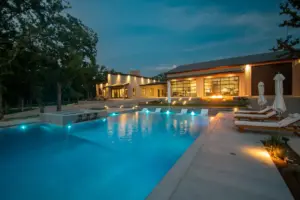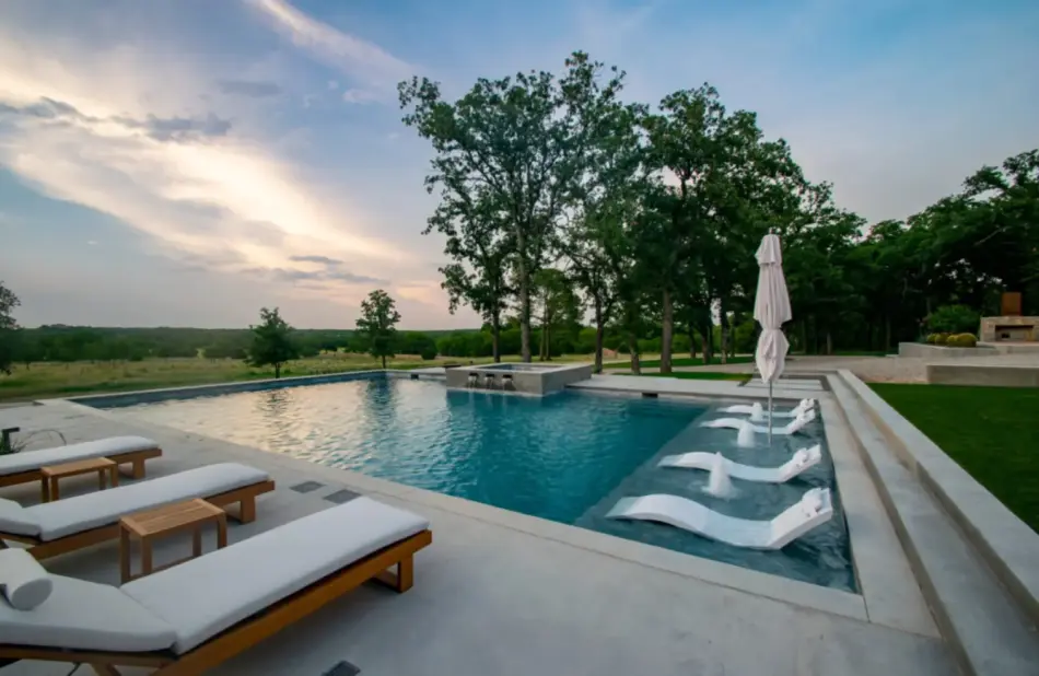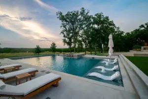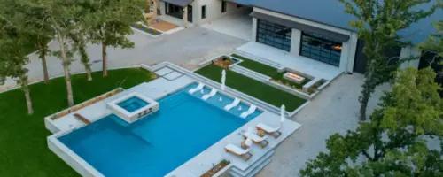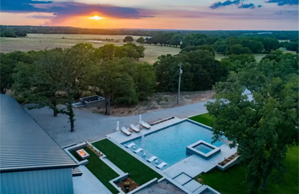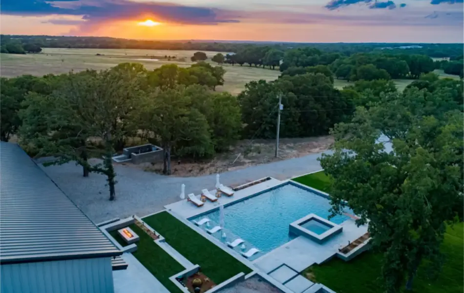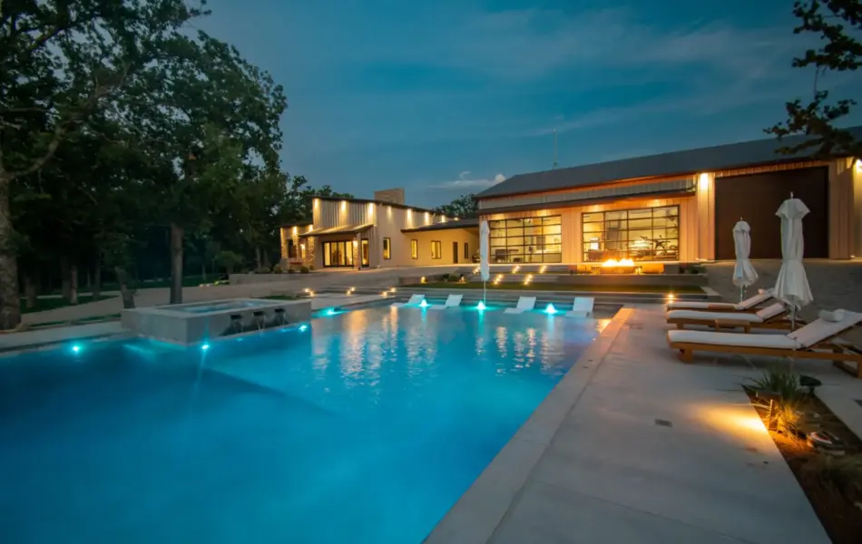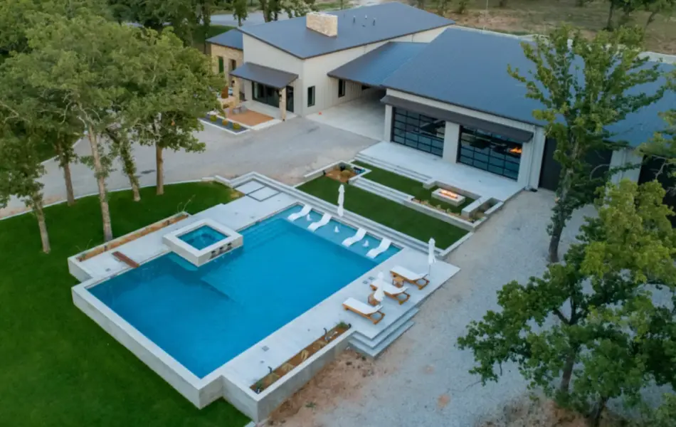 The poured in place walls, fire pit, spa, and wall veneers matched the existing walls on the site of this modern barndominium. Terraced into the hillside between the two driveways and centered on the view from inside this pool creates great zones for activity and relaxation.