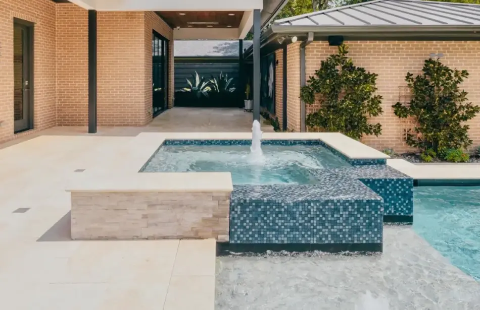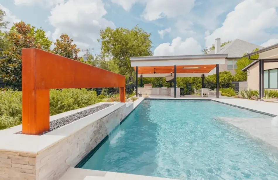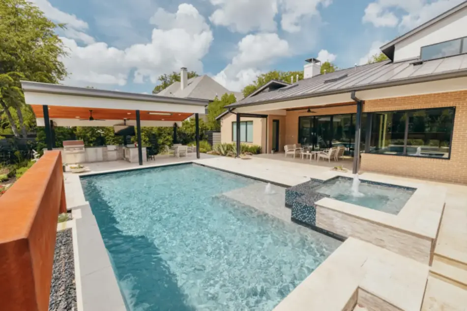 - Features: Blue Surf PebbleSheen • Grey Oak Travertine • Ivory Travertine • Outdoor Kitchen • Raised Spa • Shed Roof Cabana • Sheer Descent •