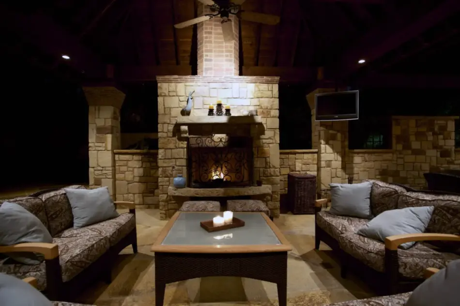 Fireplace and full outdoor kitchen and sink for relaxing and entertaining.