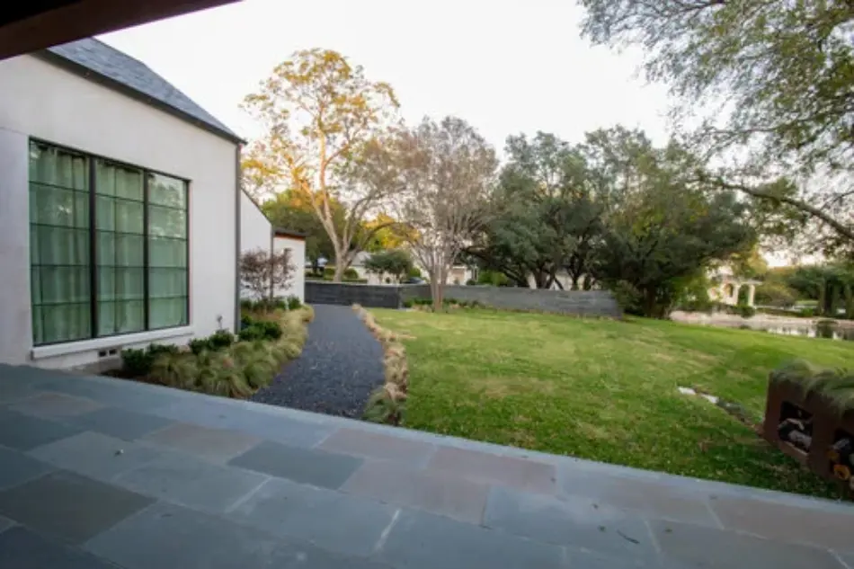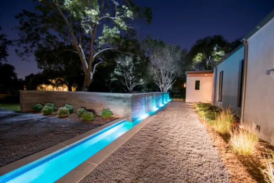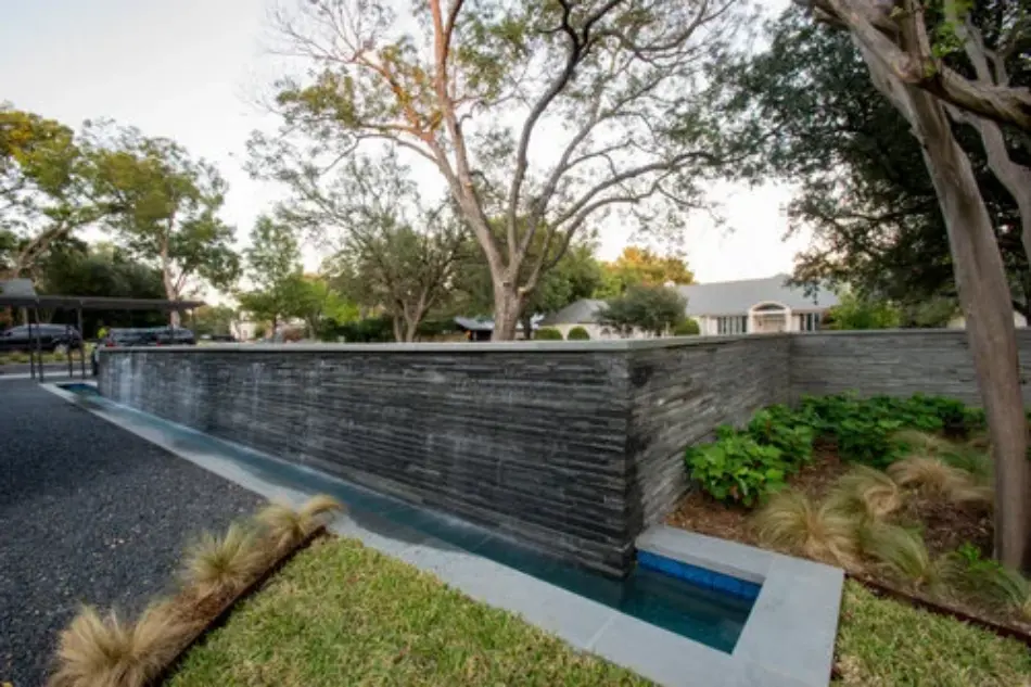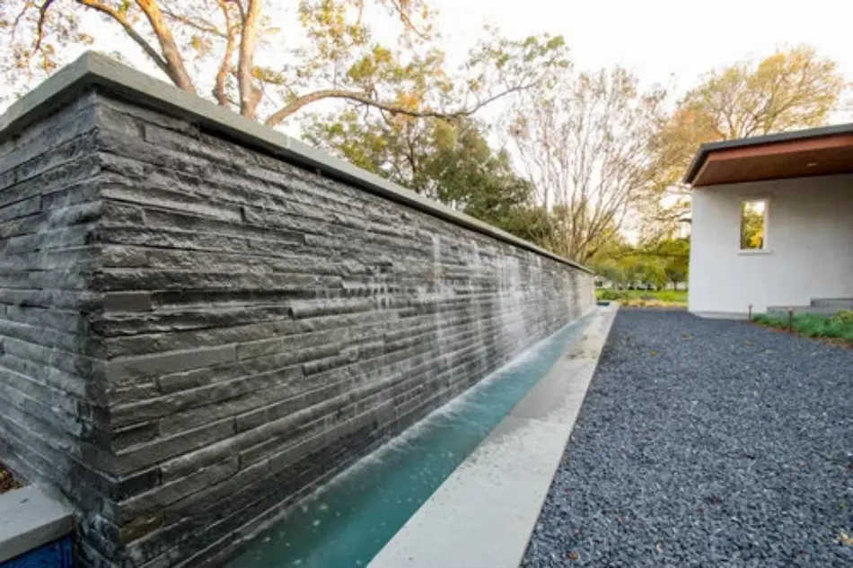 The wall creates the space between the public street and the private home, leave your stress of the world and come relax at home. The dry stack Bluestone was decided on after six sample walls were constructed. It closest matches the color of the roof and architectural lines of the home. The surprise upon entry is first the sound of water and then, the visual feature the whole walk to the front door. The stone wall extends into the tank, eliminating the tile line. The Infloor system keeps the basin cleaned. The water extended past the entry drawing you into the space facing the lake. The wall height was kept constant even as the ground sloped towards the lake. This height screened cars, from the court, when you were sitting on the patio. Large tree’s root systems determined where the wall turns occurred and still give maximum feel of the backyard. The private space with the constant trickle of water provides the perfect place of peace.
