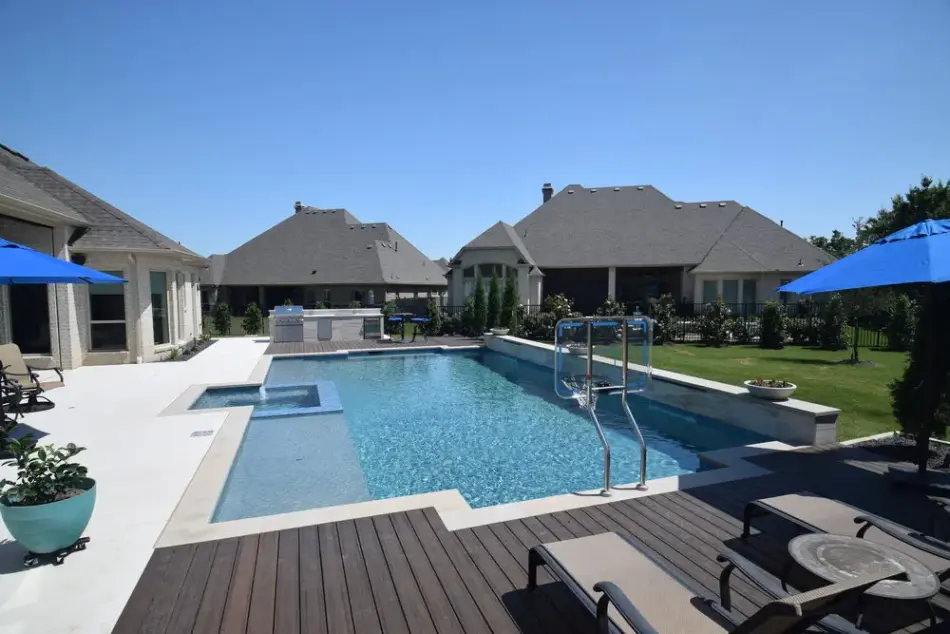 - Features: Aqua Blue PebbleSheen • Basketball Hoop • Broomed Concrete • Buff Lueders • Flush Spa • Sheer Descent • Tanning Ledge •
