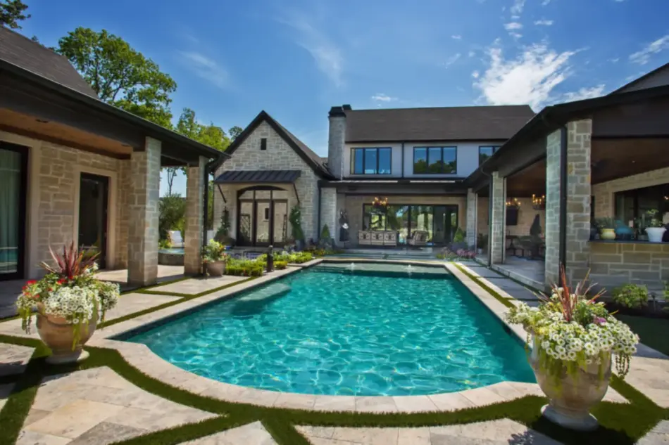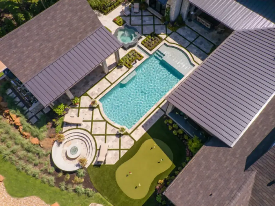 - Features: Aqua Blue PebbleSheen • Garden • Putting Green • Raised Spa • Sunken Fire Pit • Tanning Ledge •