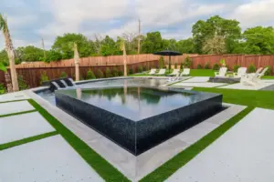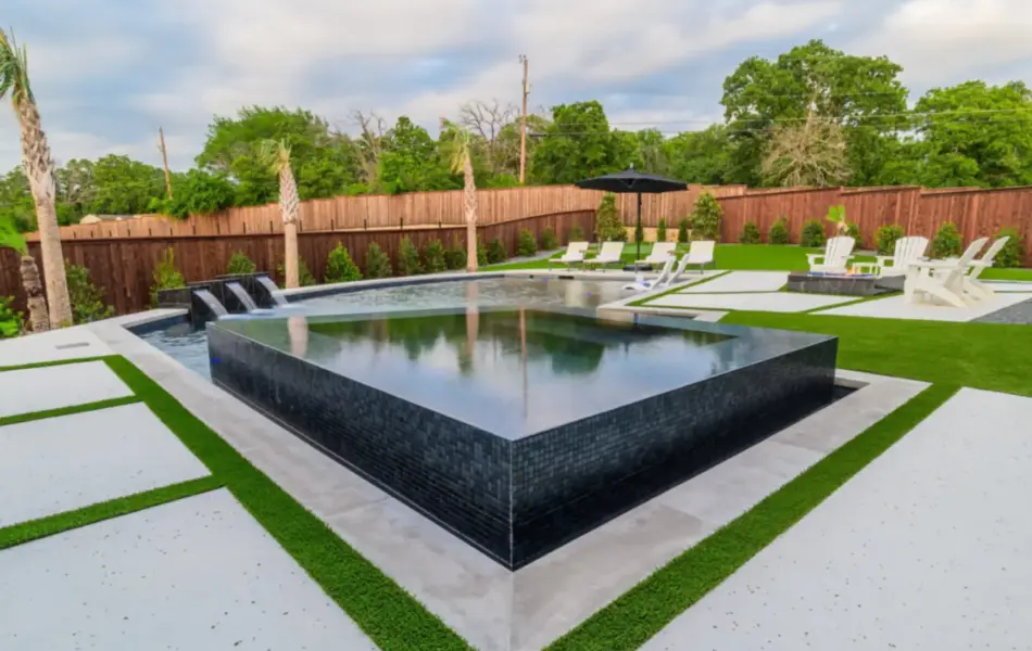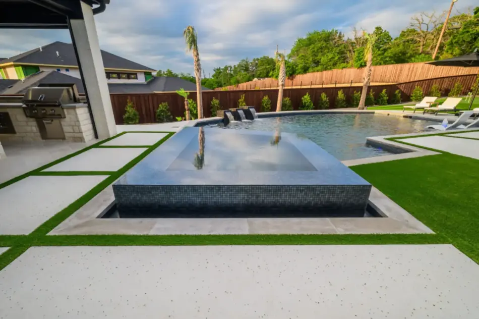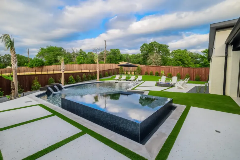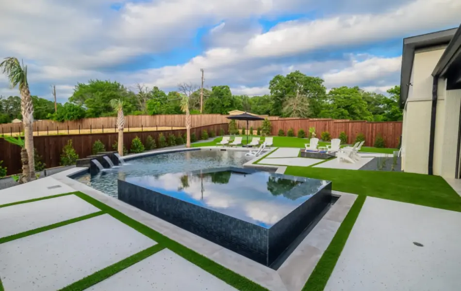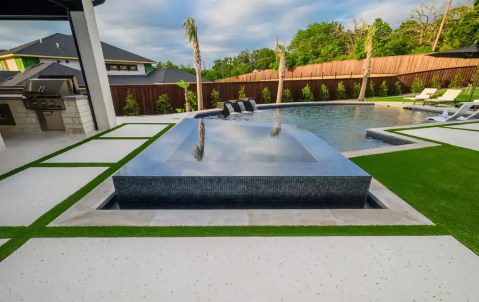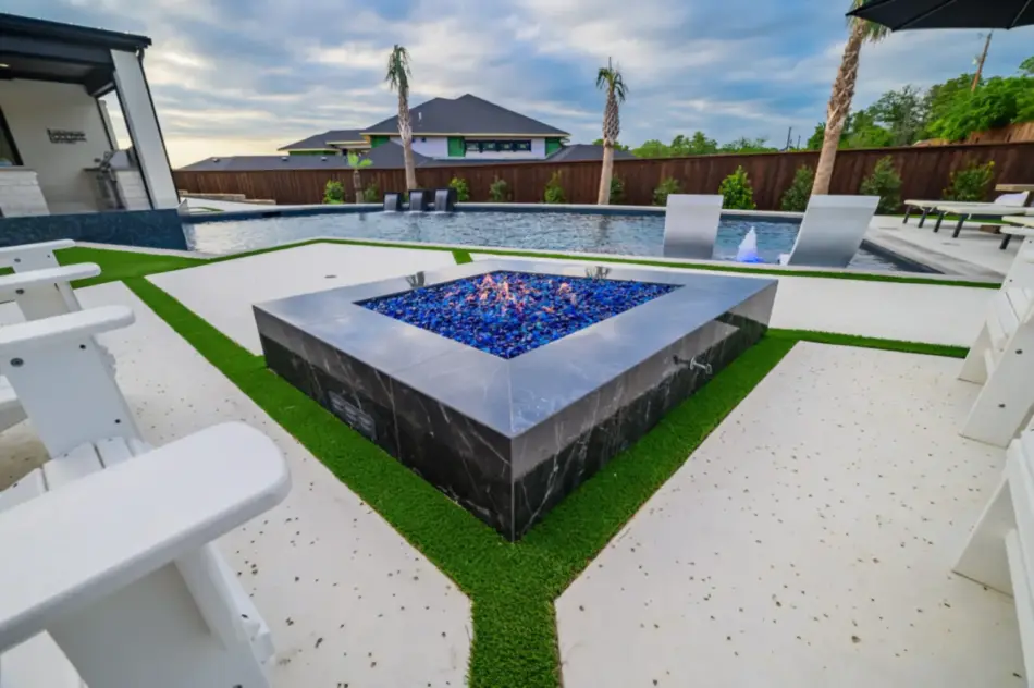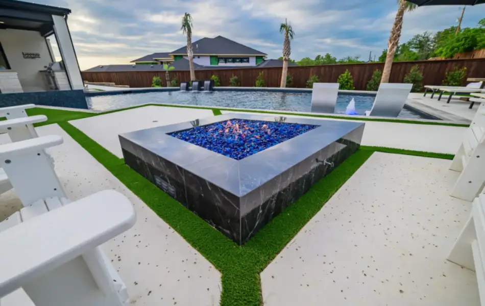 - Features: Bubblers • Fire Pit • Glass Tile • Ocean Blue PebbleSheen • Rain Sheer Descent • Raised Spa • Tanning Ledge • Turf •