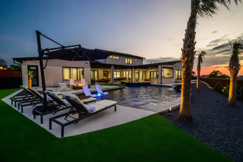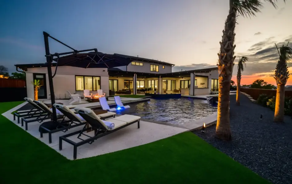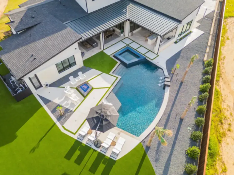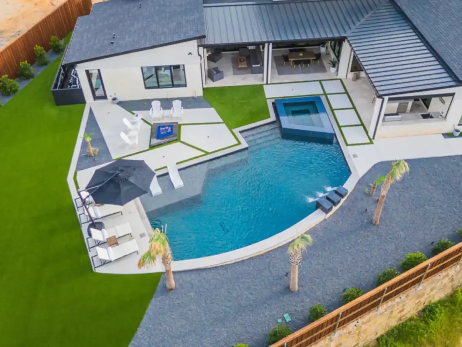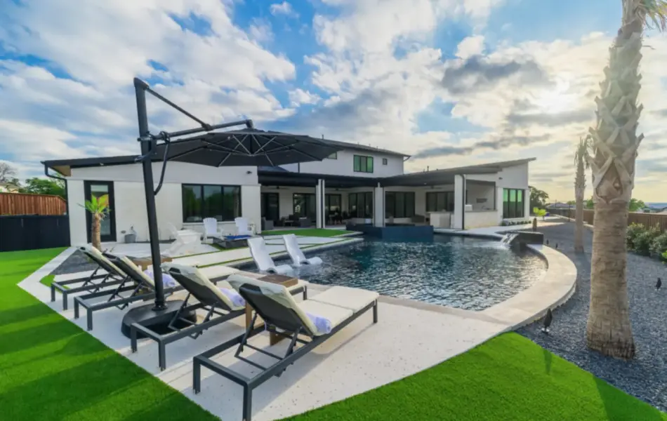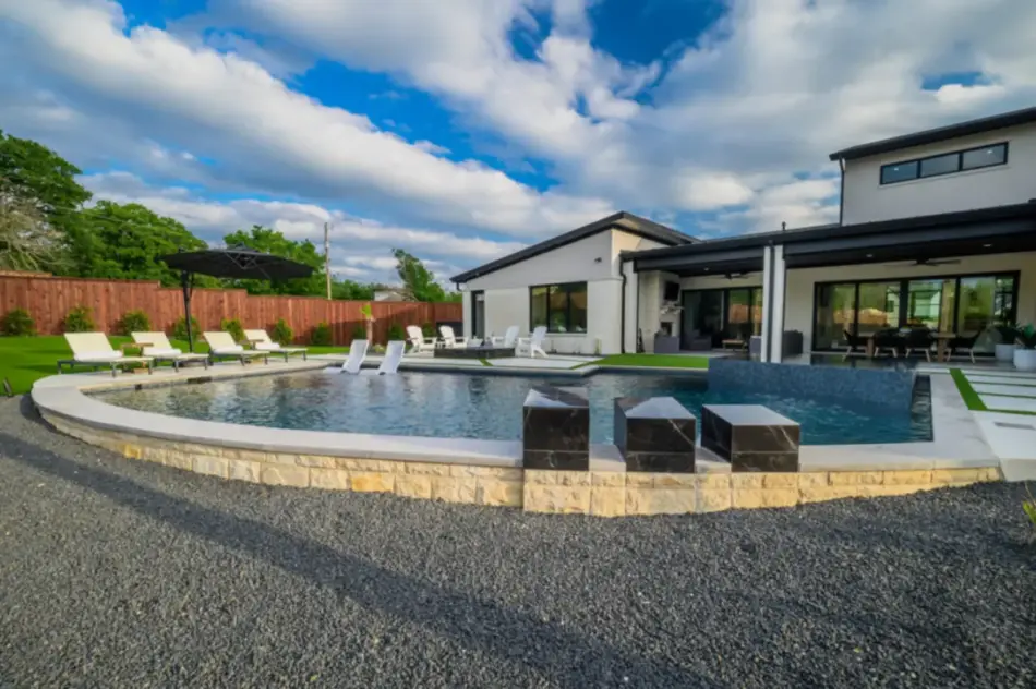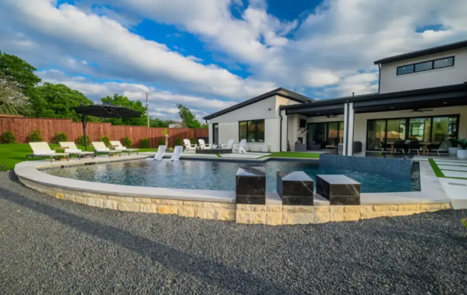 - Features: Bubblers • Fire Pit • Glass Tile • Ocean Blue PebbleSheen • Rain Sheer Descent • Raised Spa • Tanning Ledge • Turf •