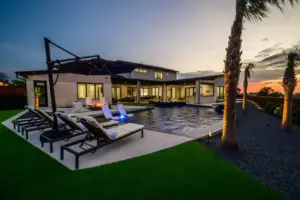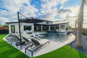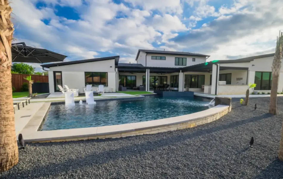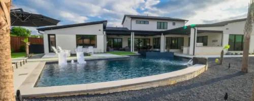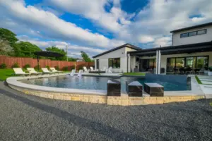 Project has a modern feel without following the traditional rectangle approach. Using the style of the home to create a flow that carries away from the house we designed a space that has many destinations that brings the whole yard together. The Perimeter overflow spa and the spa has a mirroring shape that is outside the box. With a soft curve on the backside, it allowed the pool to widen giving more swim area while also following the property line and open up and use more of the yard. The style and aesthetic is clean, modern and creative with a calming nature. The subtle outside the box details like the shape and angles without any tall or loud features achieve the clean, modern look while giving us the calming space that was desired.