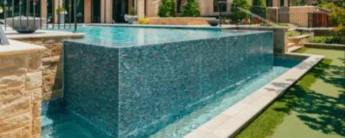 • Features: Aqua Blue PebbleSheen Bubblers Fire Pit Ivory Travertine Negative Edge Raised Spa