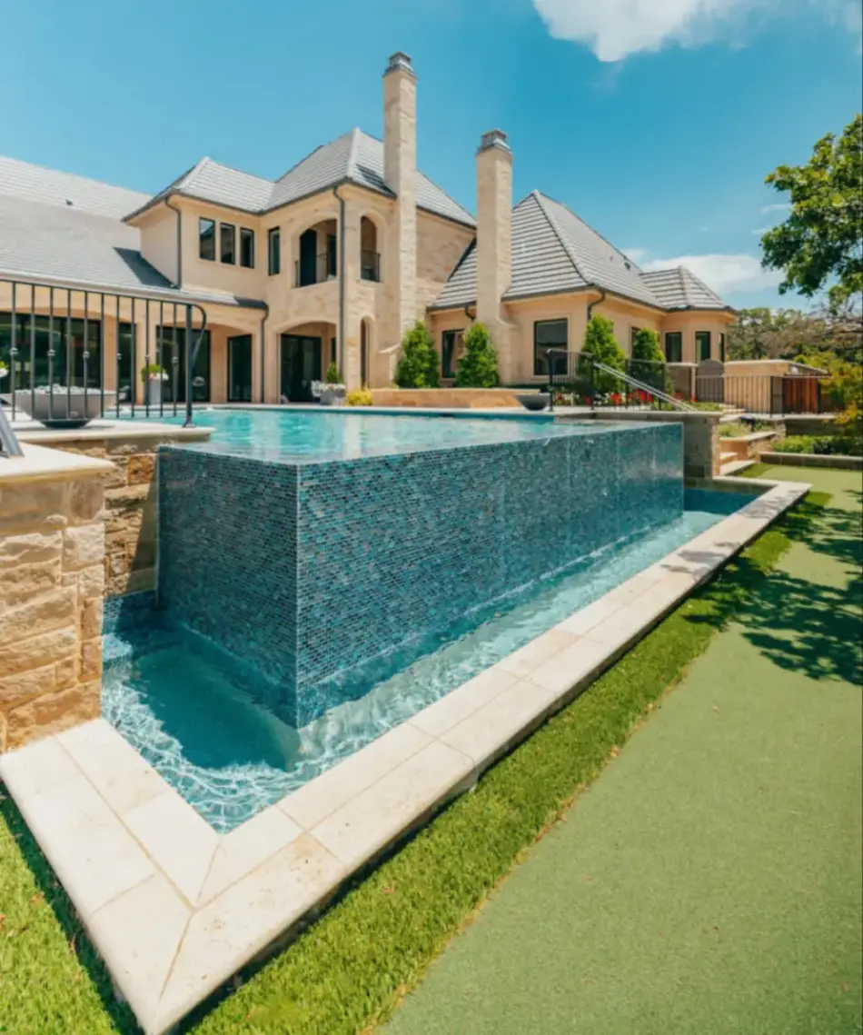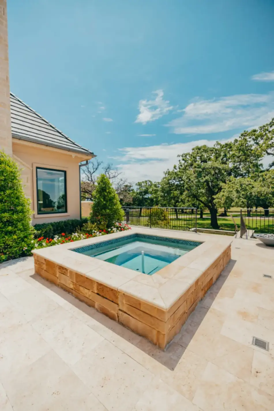• Features: Aqua Blue PebbleSheen Bubblers Fire Pit Ivory Travertine Negative Edge Raised Spa