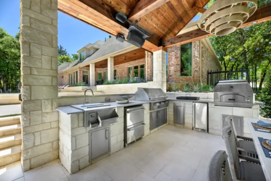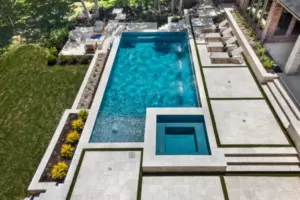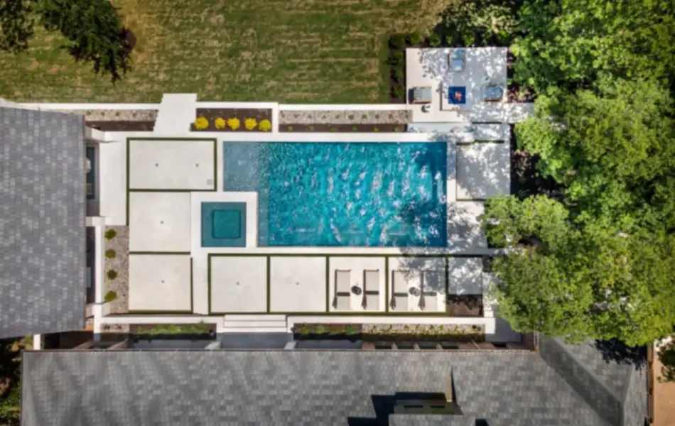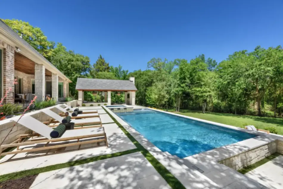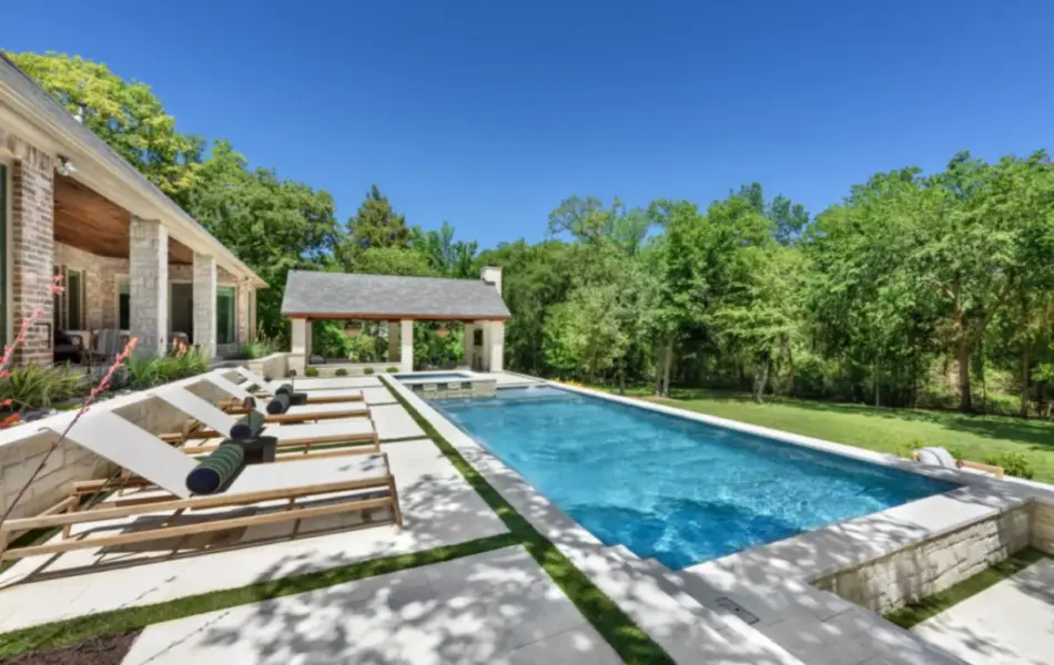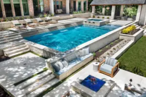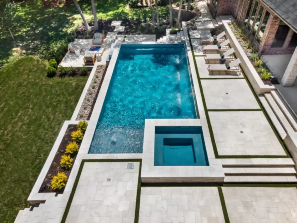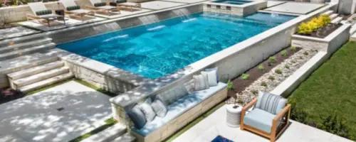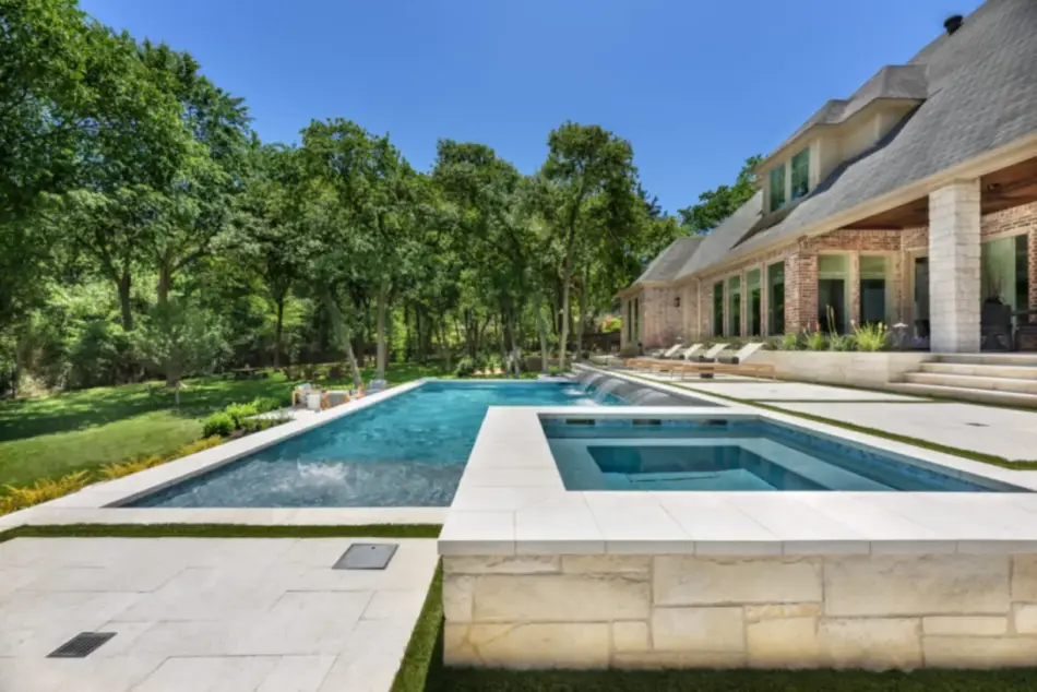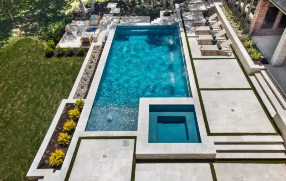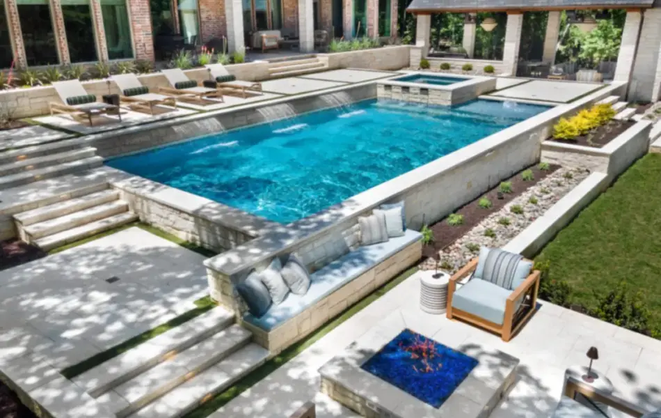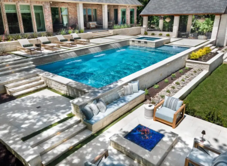 - Features: Aqua Blue PebbleSheen • Cabana • Fireplace • Flush Spa • Glass Tile • Outdoor Kitchen • Raised Spa • Turf •