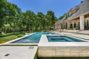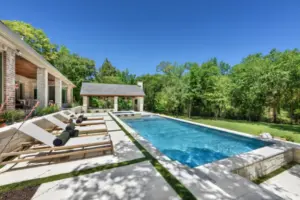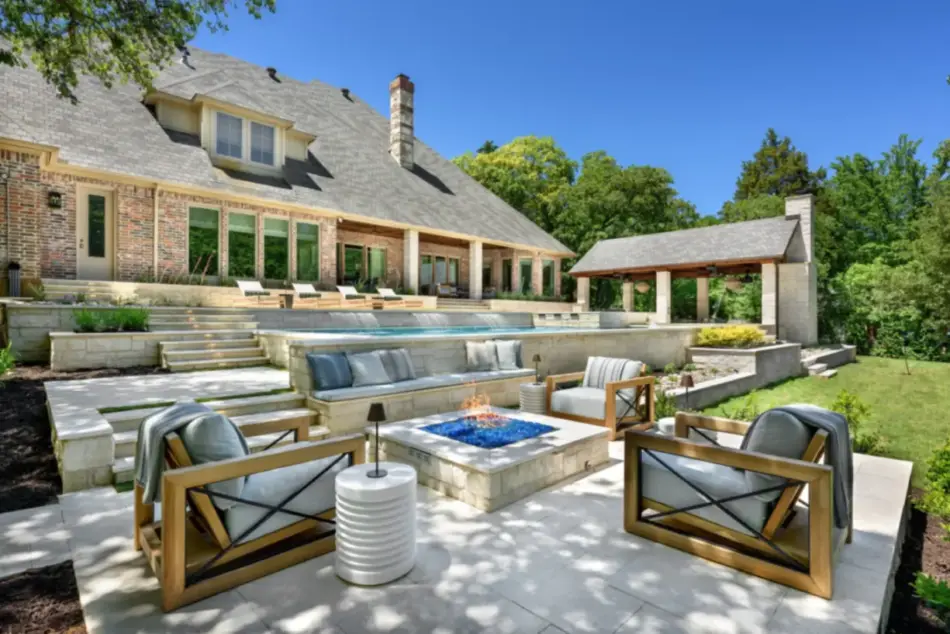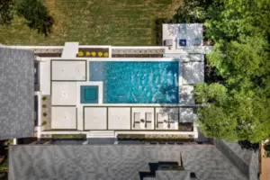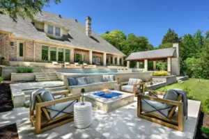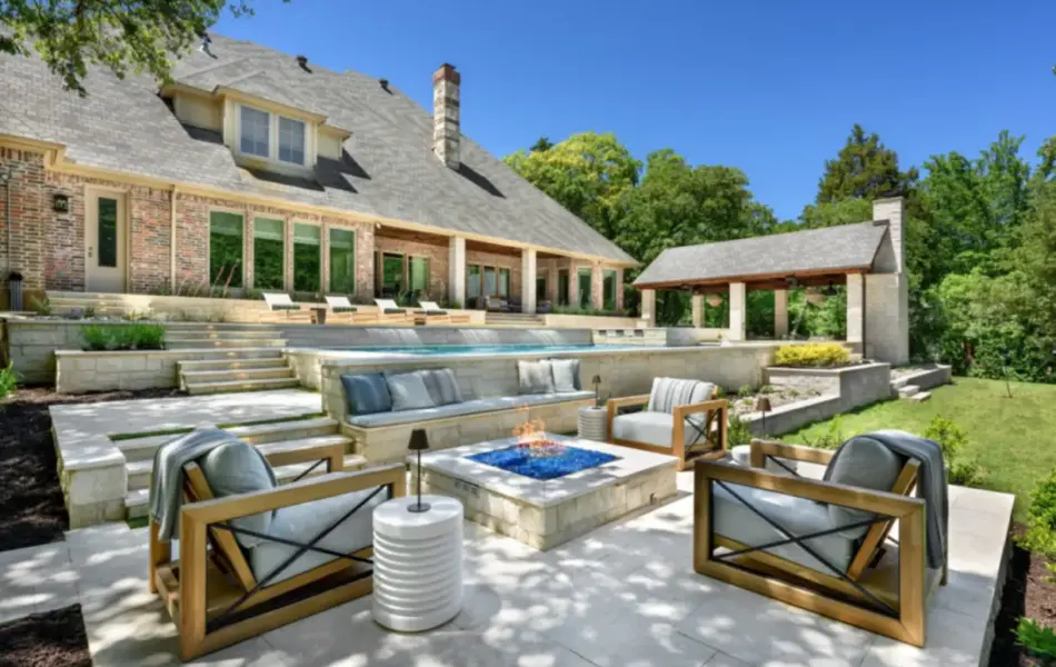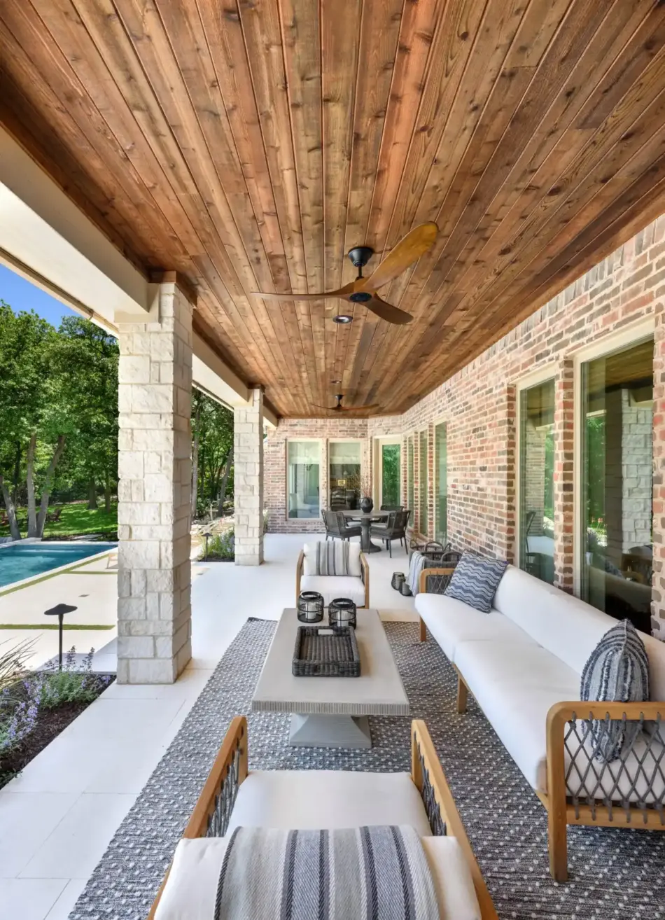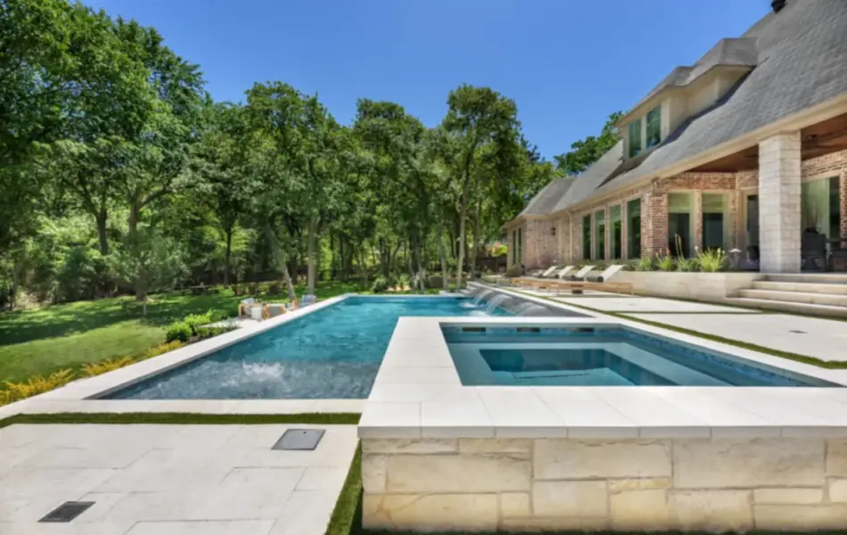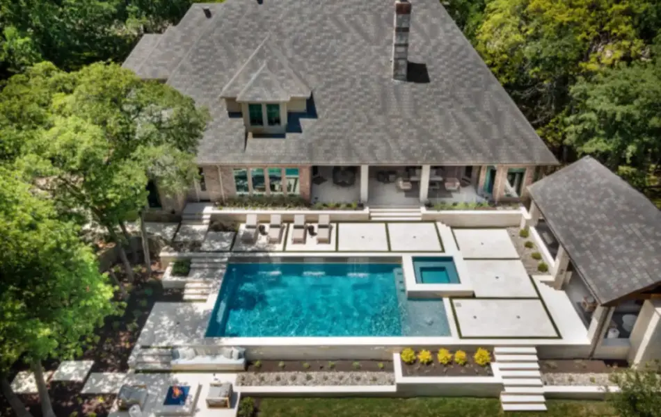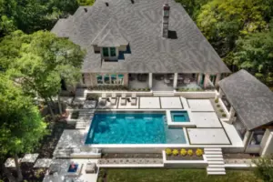 It is like a puzzle how all the pieces fit together to create spaces to entertain and live. The walls become seating, kitchen counters, bar tops and water walls terraced down the hillside so great views of every space from both inside the home to out in the garden. This also worked with the tree elevations and allowed walking to the garage and into the garden from the cabana and fire pit at the right elevation. The sheer rain waterfalls give a great visual accent and sound. The stone finger ledge allows kids to swim over and play under the water. The recent modernization of the interior spilled out into the exterior with clean lines and light colors. The front house stone was incorporated with all the veneer including removing the brick/flagstone porch column veneer and using the matching house stone. A TNG Cedar ceiling was used on the porch and continued into the pierid cabana. The cabana drop brick ledge also featured the stone veneer. The cabana roof was a Gable to allow views through to the garden from the master bedroom sitting area. Limestone decking provided a cool light surface with turf accents to bring more of a garden feel into the space.