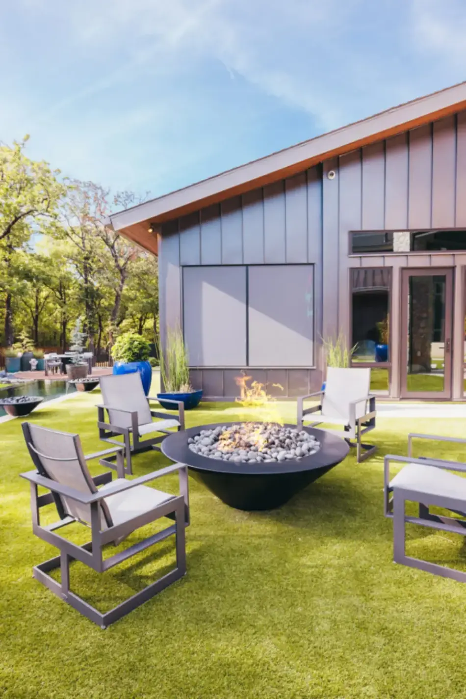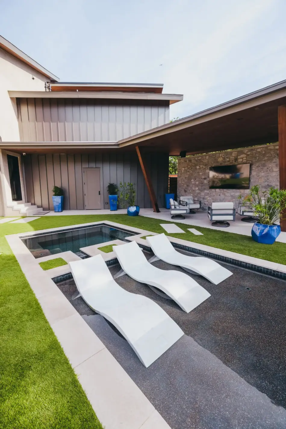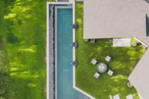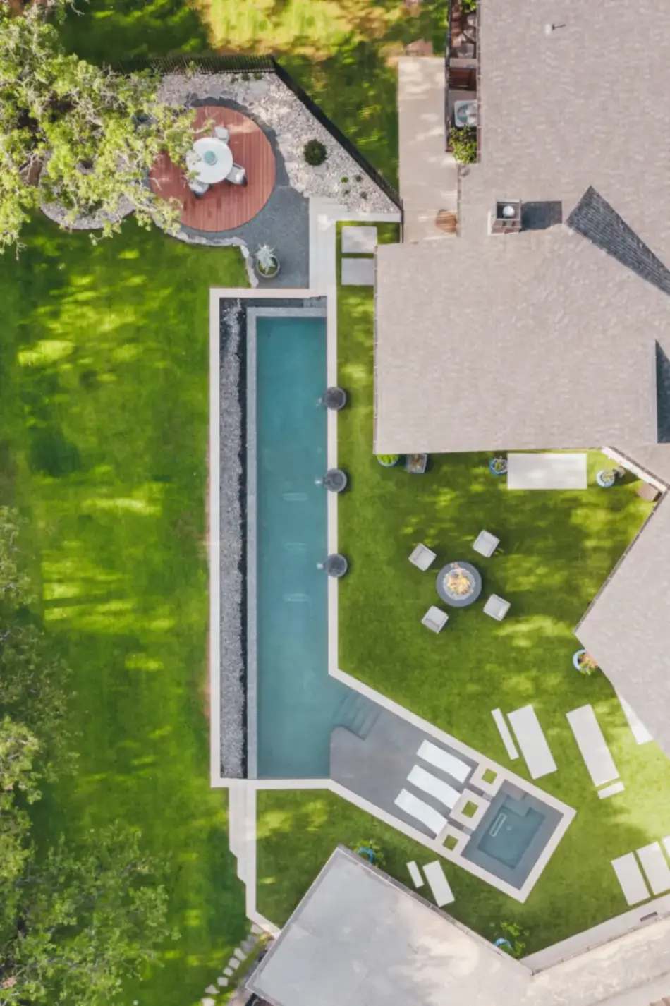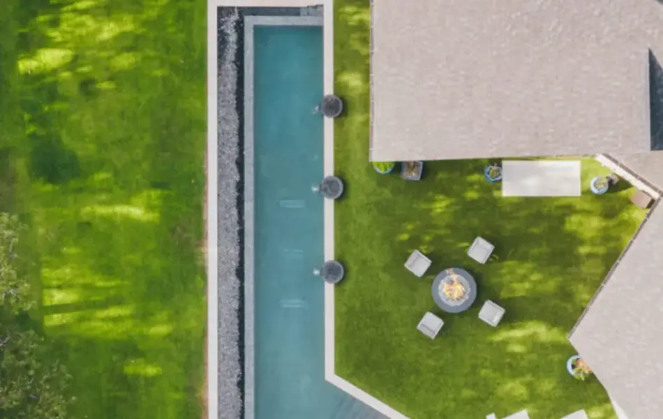 Lap pool with unique angles and long vanishing edge. Contemporary angular pool in country setting.