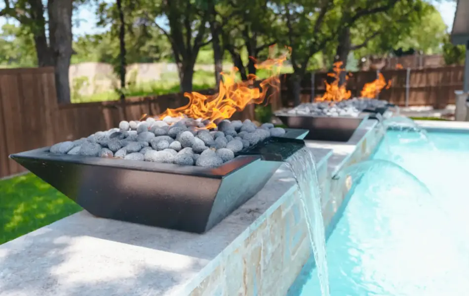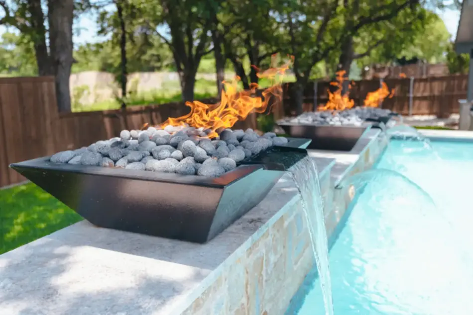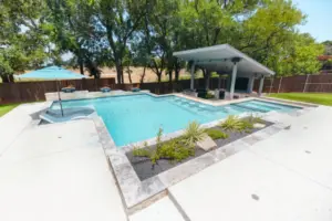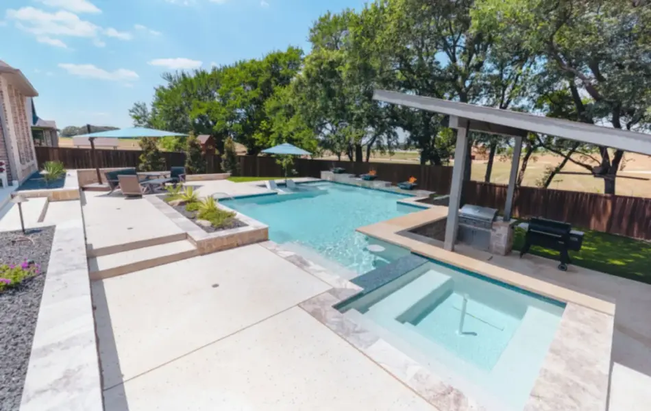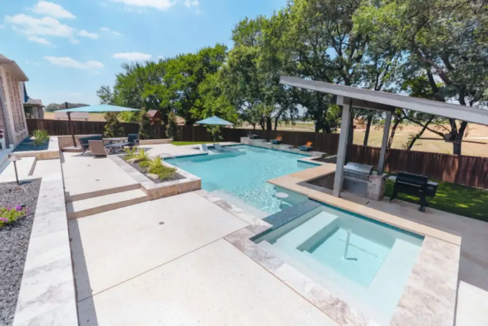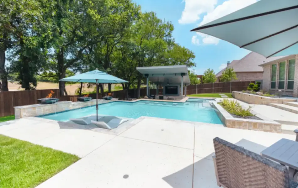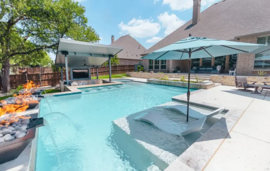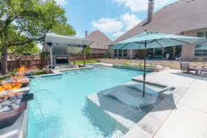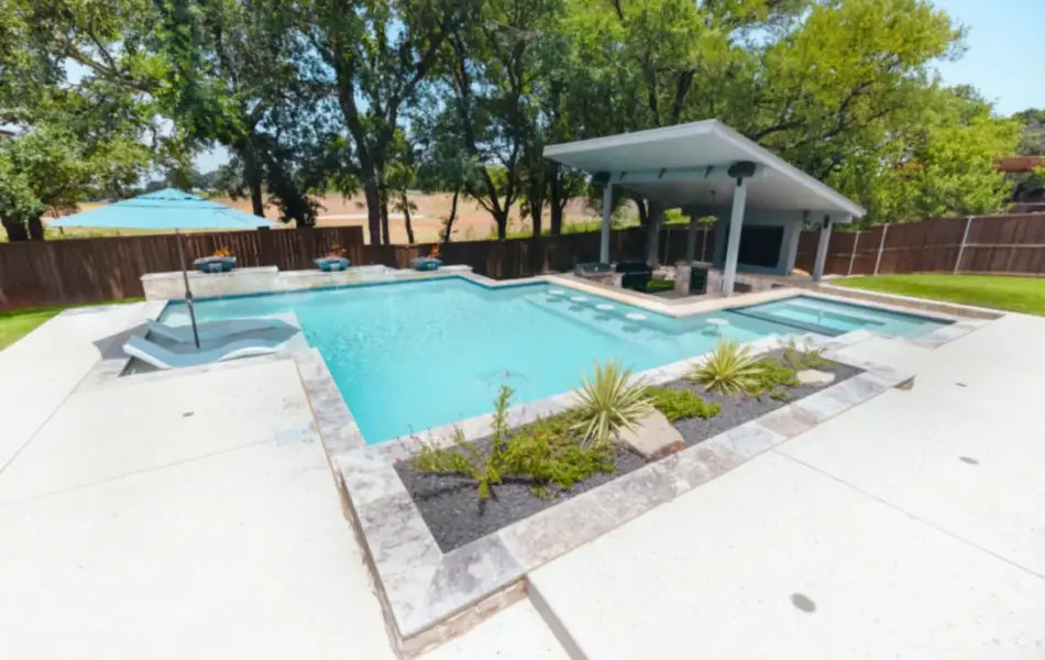 - Features: Cabana • Fire/Water Bowl • Flush Spa • Granbury Blue Streak Stone • In-Pool Bar Stools • Outdoor Kitchen • Silver Travertine • Tanning Ledge • White Diamonds PebbleSheen •